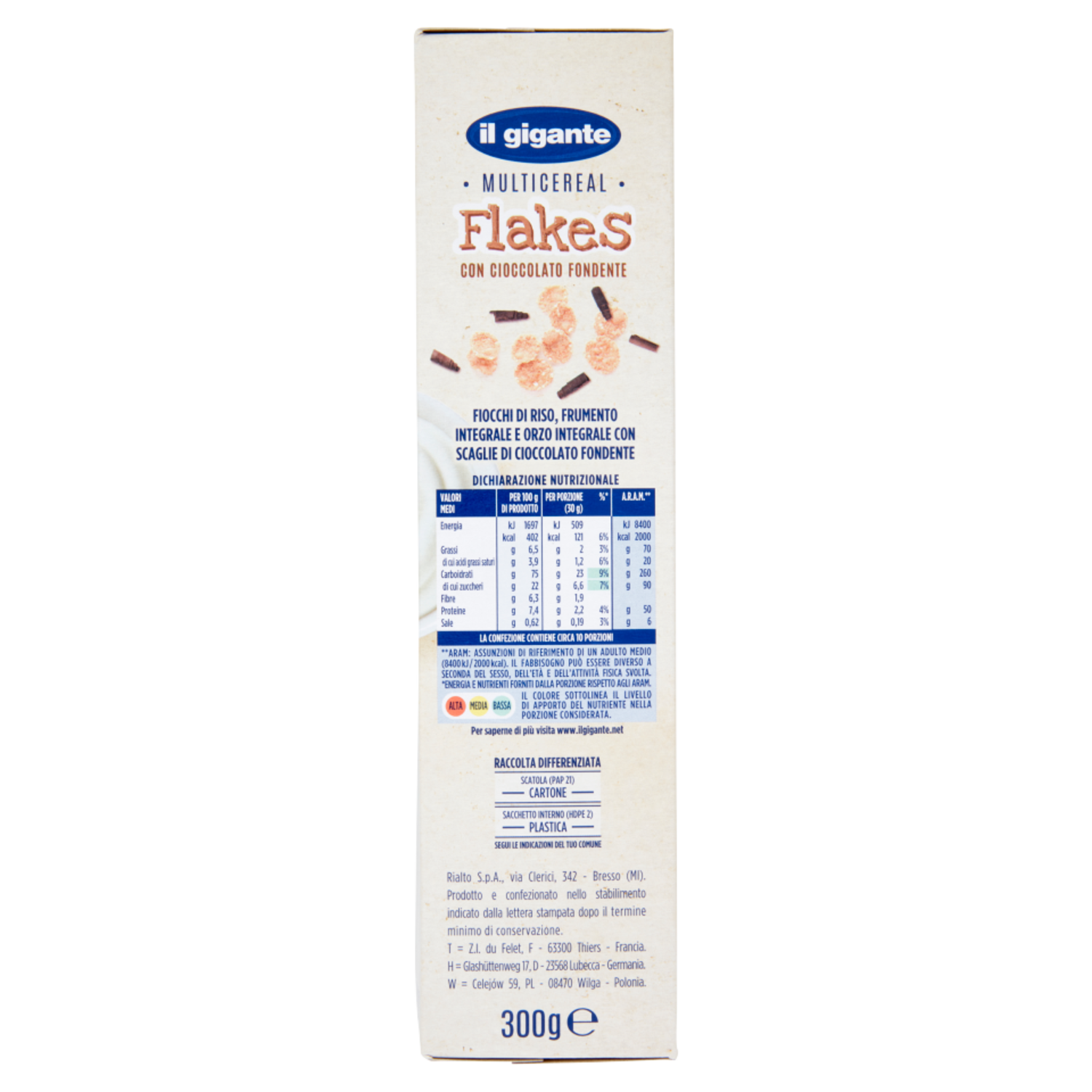 Rialto S.p.A. via Clerici, 342 Bresso (MI) Prodotto e confezionato nello stabilimento indicato dalla lettera stampata dopo il termine minimo di conservazione T = Z.I. du Felet, F - 63300 Thiers - Francia H = Glashüttenweg 17, D - 23568 Lubecca - Germania W = Celejów 59, PL - 08470 Wilga - Polonia