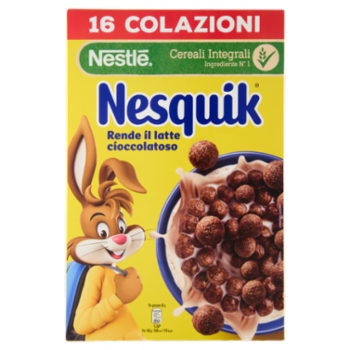 Inizia la tua giornata con gusto! Cereali integrali 1° ingrediente Rendi il tuo latte cioccolatoso Il gusto unico di NESQUIK 7 vitamine e minerali A colazione gusta la tua tazza preferita di NESQUIK! *Nutre le tue idee - Il Ferro contribuisce alla normale funzione cognitiva e anche al normale sviluppo cognitivo dei bambini. - Le Vitamine B6 e B3 (Niacina) contribuiscono alle normali funzioni psicologiche. - L'Acido Pantotenico (B5) contribuisce a prestazioni mentali normali. Consuma i Cereali NESQUIK come parte di una dieta varia ed equilibrata e di uno stile di vita sano. - 16 Colazioni - Cereali Integrali - Ingrediente N° 1 - Rende il latte cioccolatoso