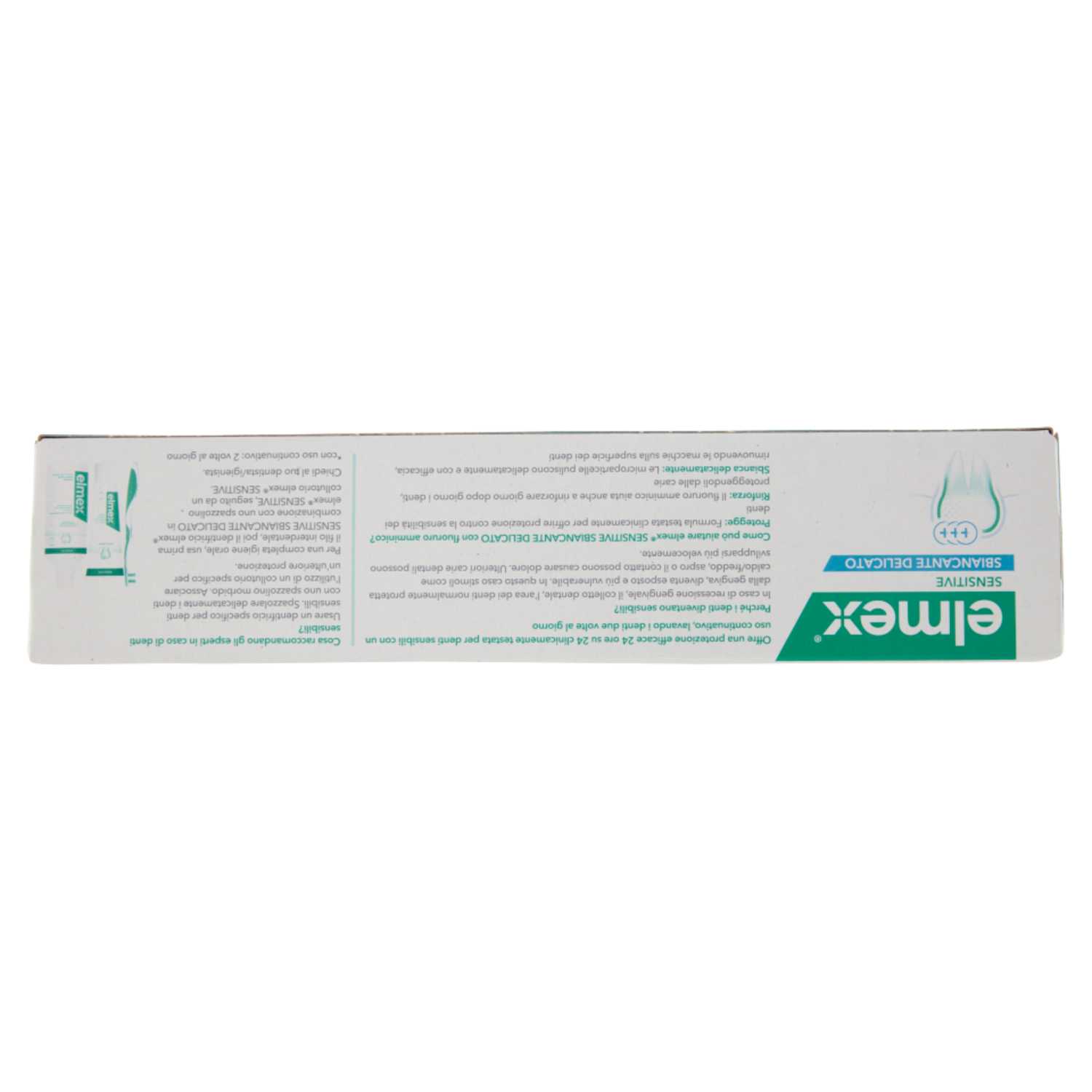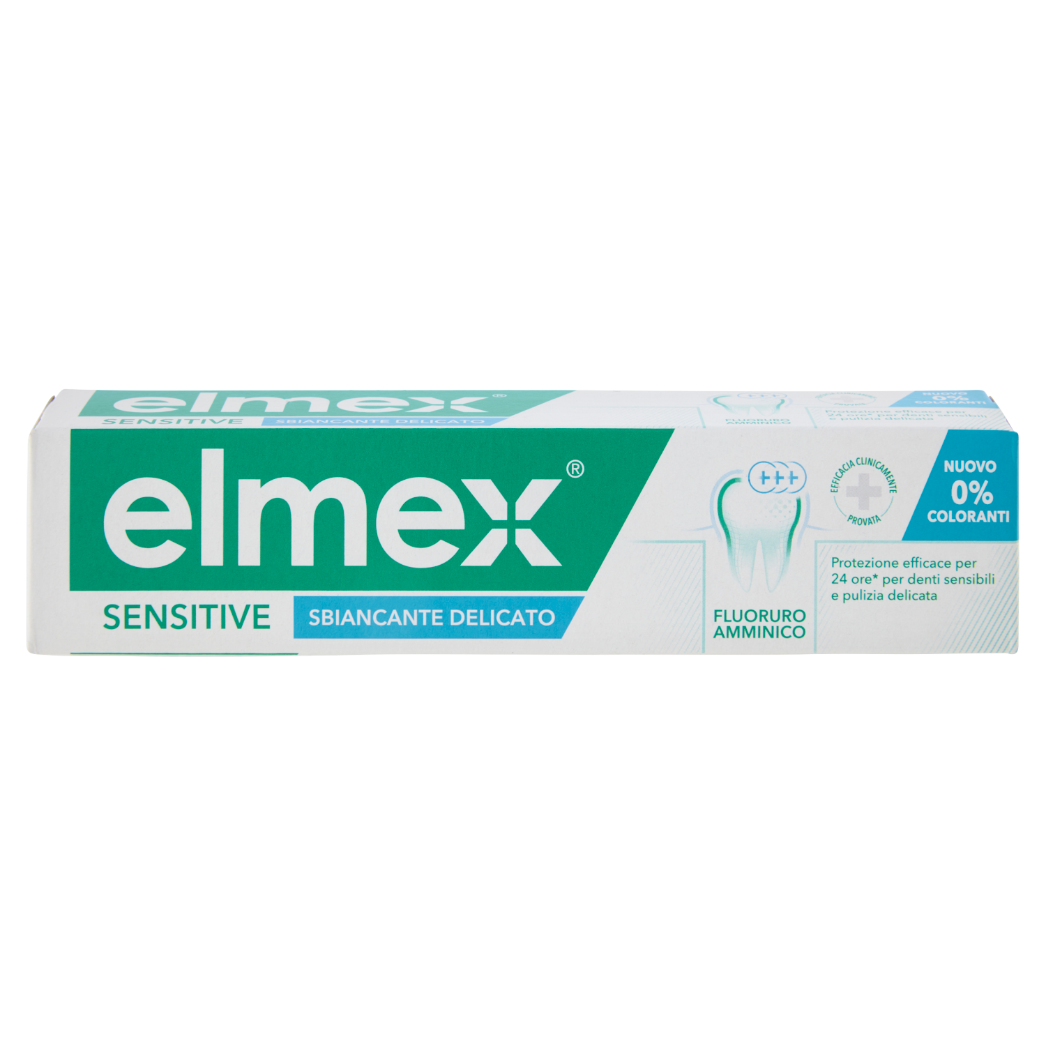 Offre una protezione efficace 24 ore su 24 clinicamente testata per denti sensibili con un uso continuativo, lavando i denti due volte al giorno Perché i denti diventano sensibili? In caso di recessione gengivale, il colletto dentale, l'area dei denti normalmente protetta dalla gengiva, diventa esposto e più vulnerabile. In questo caso stimoli come caldo/freddo, aspro o il contatto possono causare dolore. Ulteriori carie dentali possono svilupparsi più velocemente. Come può aiutare elmex Sensitive Sbiancante Delicato con fluoruro amminico? Protegge: Formula testata clinicamente per offrire protezione contro la sensibilità dei denti Rinforza: Il fluoruro amminico aiuta anche a rinforzare giorno dopo giorno i denti, proteggendoli dalle carie Sbianca delicatamente: Le microparticelle puliscono delicatamente e con efficacia, rimuovendo le macchie sulla superficie dei denti Sensitive Sbiancante Delicato - dentifricio specifico per la protezione quotidiana dei denti sensibili.