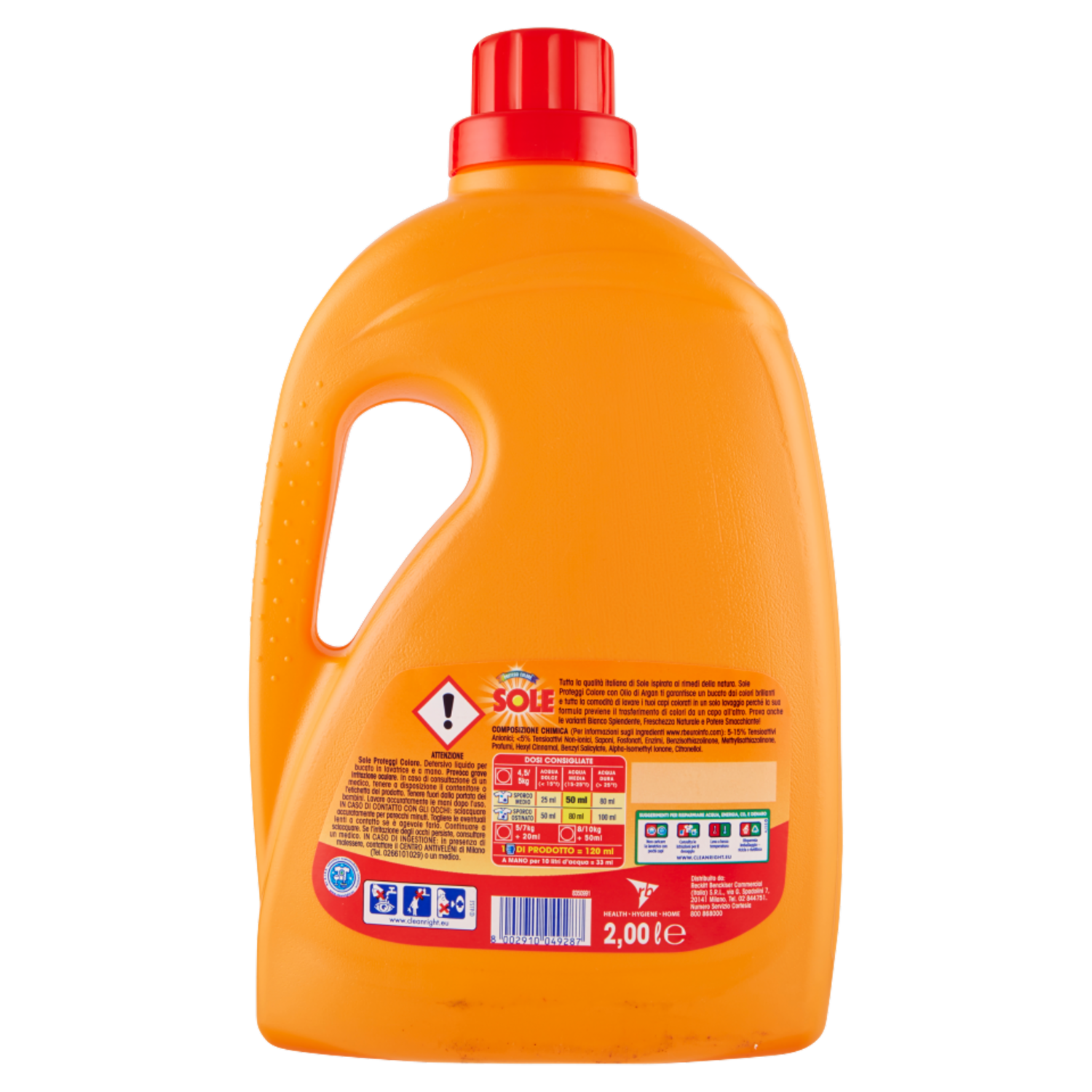 ATTENZIONE Sole Proteggi Colore. Detersivo liquido per bucato in lavatrice e a mano. Provoca grave irritazione oculare. In caso di consultazione di un medico, tenere a disposizione il contenitore o l'etichetta del prodotto. Tenere fuori dalla portata dei bambini. Lavare accuratamente le mani dopo l'uso. IN CASO DI CONTATTO CON GLI OCCHI: sciacquare accuratamente per parecchi minuti. Togliere le eventuali lenti a contatto se è agevole farlo. Continuare a sciacquare. Se l'irritazione degli occhi persiste, consultare un medico. IN CASO DI INGESTIONE: in presenza di malessere, contattare il CENTRO ANTIVELENI di Milano (Tel. 0266101029) o un medico. A.I.S.E. www.cleanright.eu