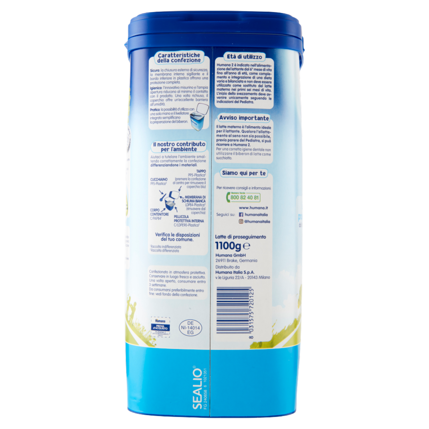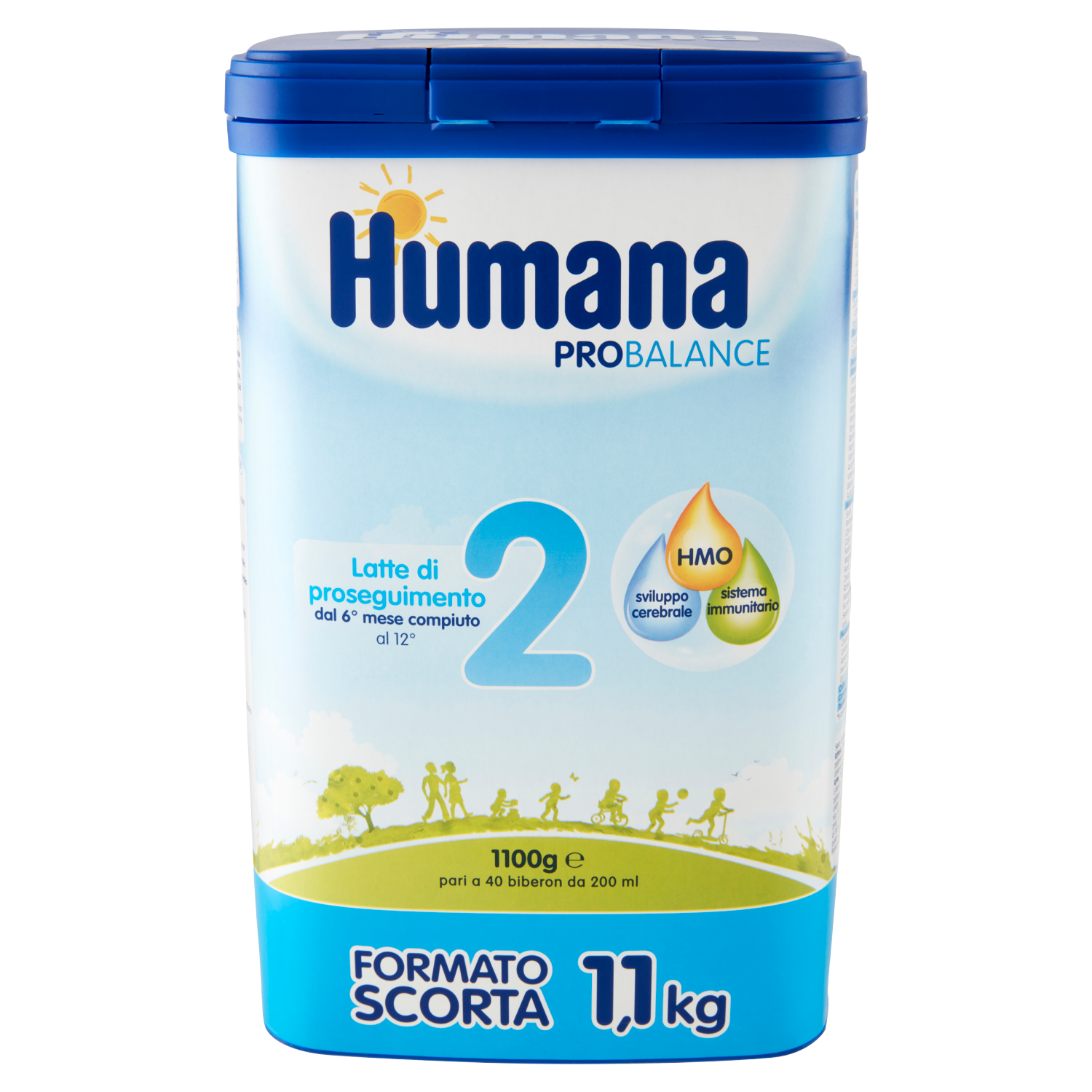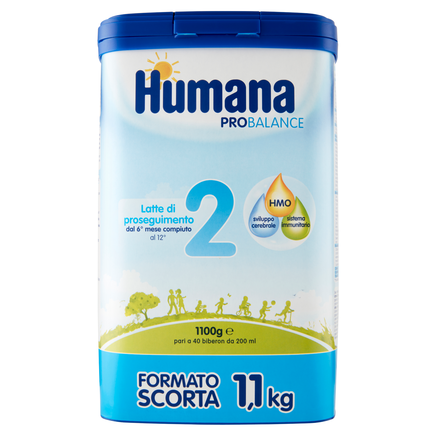 Studiato per accompagnare la sua crescita Il tuo piccolo sta crescendo, diventando sempre più attivo e iniziando ad assaporare cibi dalle consistenze solide. All'interno di una dieta varia e bilanciata, Humana 2 ProBalance accompagna il tuo piccolo nelle scoperte di ogni giorno, fornendogli i nutrienti di cui ha bisogno nelle giuste quantità in base all'età: - HMO, oligosaccaridi del latte umano, uno dei principali componenti del latte materno insieme al grasso e al lattosio. Per il nostro latte di proseguimento scegliamo l'HMO "2'FL". - DHA, acido docosaesaenoico, che contribuisce al normale sviluppo visivo dei lattanti fino a 12 mesi (si ottiene un effetto benefico con un'assunzione giornaliera di 100 mg di DHA). - ARA, acido arachidonico, un importante acido grasso omega-6. - GOS, galatto-aligosaccaridi, fibre. - ALA, acido α-linolenico, un acido grasso essenziale che contribuisce allo sviluppo cerebrale e del tessuto nervoso. - Vitamina C, che contribuisce al normale funzionamento del sistema immunitario. Humana Probalance sviluppo cerebrale, HMO, sistema immunitario Probalance è il nostro impegno a fornirgli i nutrienti di cui necessita durante la sua crescita. Caratteristiche della confezione Sicura: la chiusura esterna di sicurezza, la membrana interna sigillante e il bordo inferiore in plastica offrono una protezione completa. Igienica: l'innovativo misurino e l'ampia apertura riducono al minimo il contatto con il prodotto. Una volta richiuso, il coperchio offre un'eccellente barriera all'umidità. Pratica: la possibilità d'utilizzo con una sola mano e il livellatore integrato semplificano la preparazione del biberon.