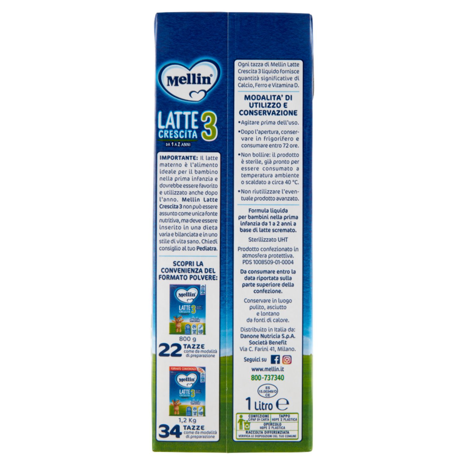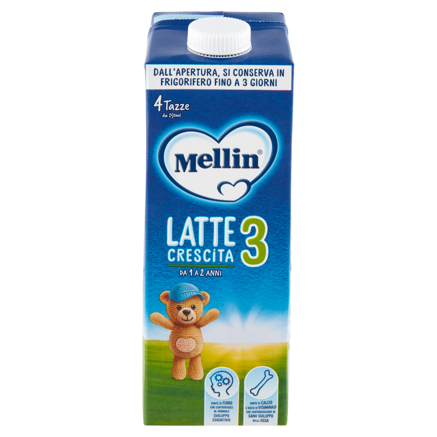 Importante: Il latte materno è l'alimento ideale per il bambino nella prima infanzia e dovrebbe essere favorito e utilizzato anche dopo l'anno. Mellin Latte Crescita 3 non può essere assunto come unica fonte nutritiva, ma deve essere inserito in una dieta varia e bilanciata e in uno stile di vita sano. Chiedi consiglio al tuo Pediatra. Ogni tazza di Mellin Latte Crescita 3 liquido fornisce quantità significative di Calcio, Ferro e Vitamina D.