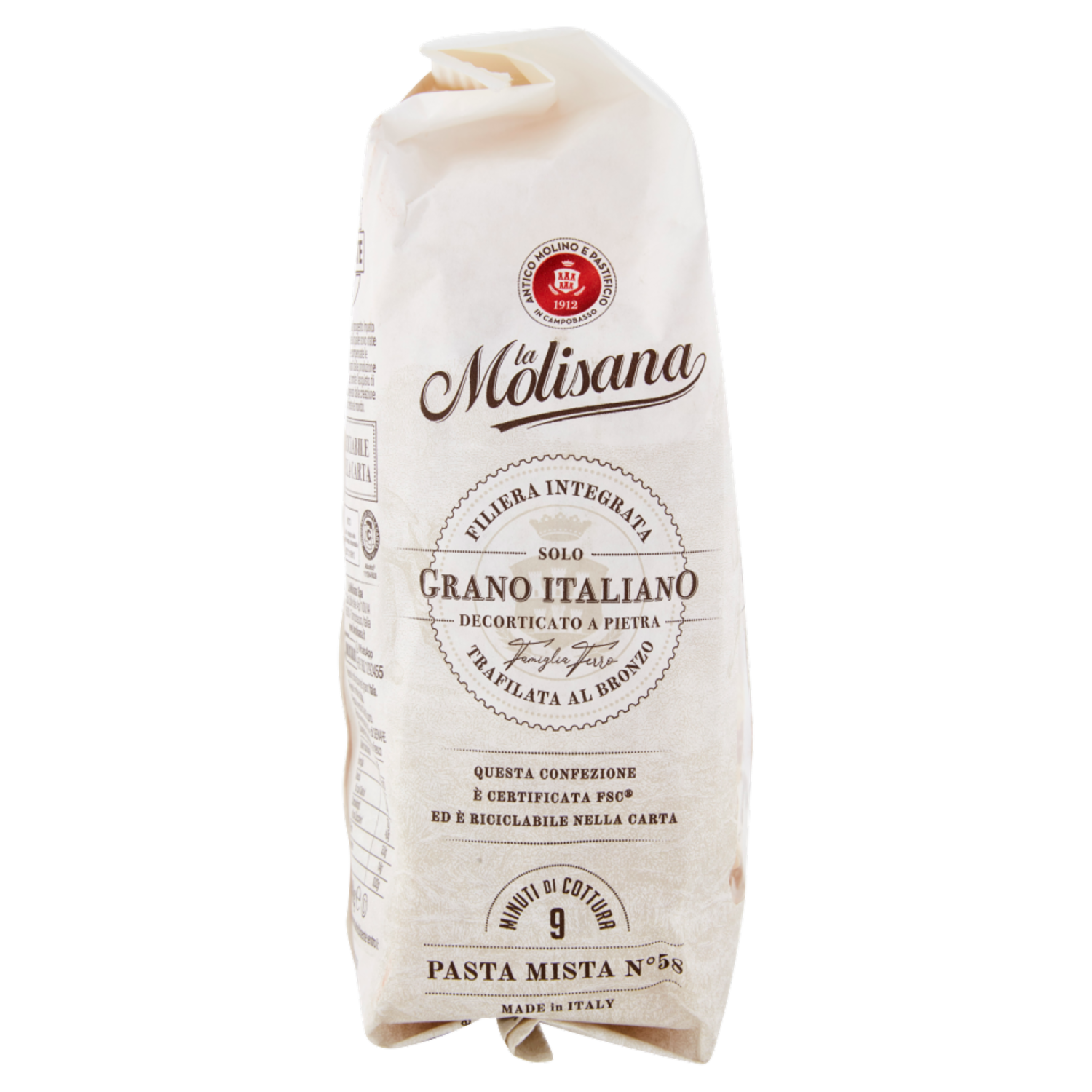 La Molisana Antico Molino e Pastificio in Campobasso 1912 Famiglia Ferro Azienda 100% italiana da filiera integrata Fondata nel 1912 da una famiglia di imprenditori italiani, interamente di proprietà italiana. Il grano Utilizziamo solo grano coltivato in Molise, Abruzzo, Puglia, Lazio e Marche, regioni da sempre vocate alla produzione di grano duro di alta qualità. Il molino Maciniamo da cinque generazioni il miglior grano, lo decortichiamo a pietra per produrre semole più sicure dal punto di vista igienico-sanitario. Il pastificio Trafiliamo al bronzo per ottenere una pasta ruvida e tenace con un'eccellente tenuta in cottura. L'acqua Impastiamo le nostre semole con acqua pura, iposodica con caratteristiche oligominerali delle sorgenti del Matese. LifeGate impatto zero CO₂ La Molisana partecipa al progetto Impatto Zero di Lifegate grazie al quale sono state calcolate, ridotte e compensate le emissioni di CO2 derivanti dalla produzione di questa confezione, tramite l'acquisto di crediti di carbonio generati dalla creazione e tutela di foreste nel mondo. Aria pura di montagna Acqua cristallina di sorgente Mugnai da cinque generazioni