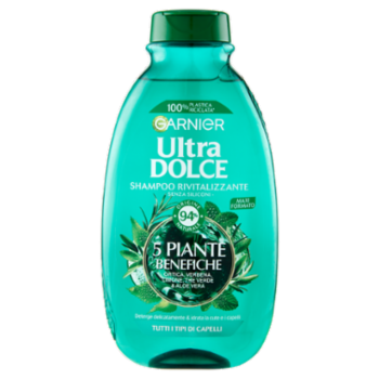 Vera infusione di tono e piacere per i capelli normali stanchi e spenti. Il nuovo shampoo Garnier Ultra Dolce ha estratto dal cuore della natura 5 piante selezionate per le loro virtù complementari: the verde, limone, eucalipto, ortica e verbena. La sua formula senza siliconi, con una consistenza in gel fondente, rispetta i vostri capelli quotidianamente, senza appesantirli. Il suo profumo intenso dalle note verdi e fresche vi regalerà una straordinaria sensazione di benessere.