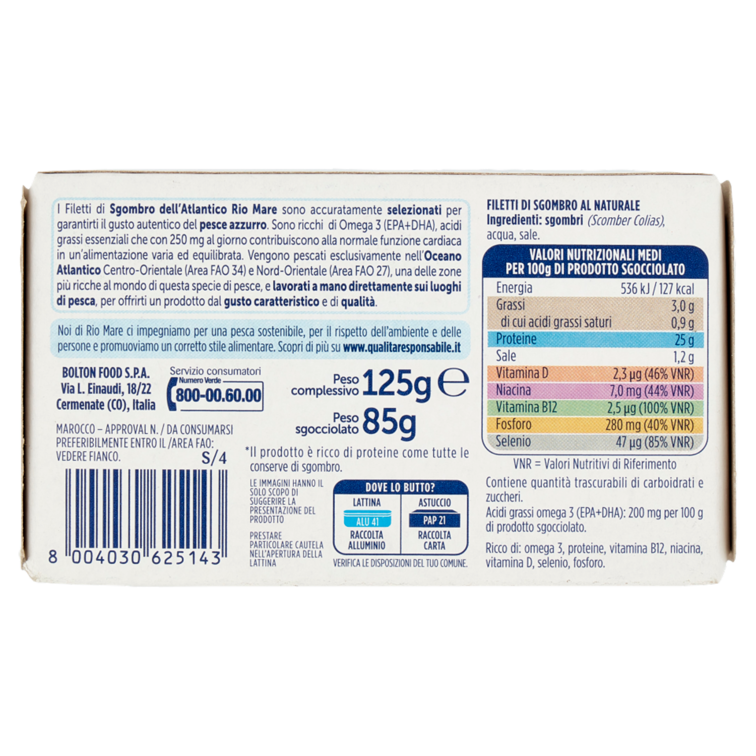 I Filetti di Sgombro dell'Atlantico Rio Mare sono accuratamente selezionati per garantirti il gusto autentico del pesce azzurro. Sono ricchi di Omega 3 (EPA+DHA), acidi grassi essenziali che con 250 mg al giorno contribuiscono alla normale funzione cardiaca in un'alimentazione varia ed equilibrata. Vengono pescati esclusivamente nell'Oceano Atlantico Centro-Orientale (Area FAO 34) e Nord-Orientale (Area FAO 27), una delle zone più ricche al mondo di questa specie di pesce, e lavorati a mano direttamente sui luoghi di pesca, per offrirti un prodotto dal gusto caratteristico e di qualità. Ricco di: omega 3, proteine, vitamina B12, niacina, vitamina D, selenio, fosforo.