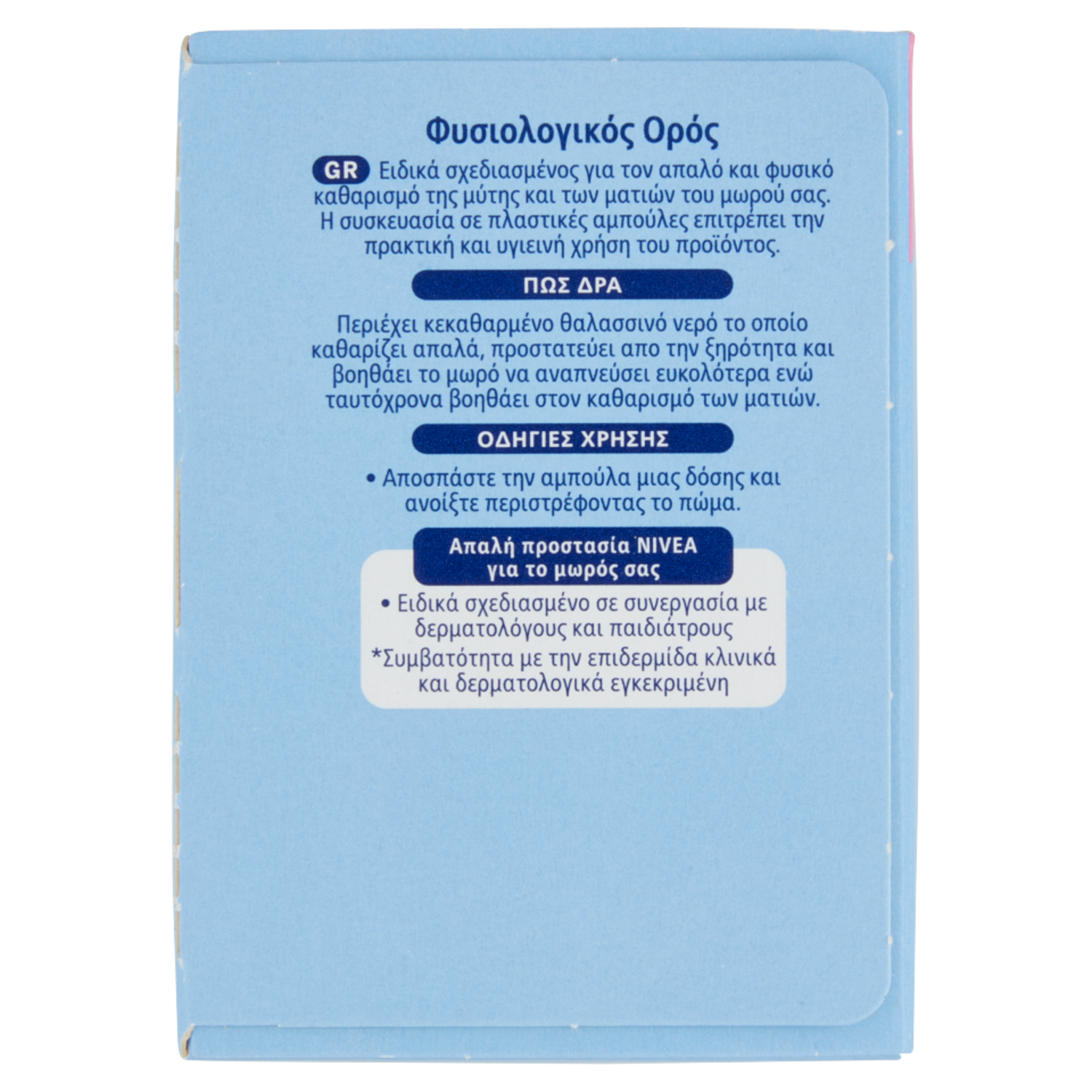 Deterge delicatamente le mucose nasali del bambino, mantenendone la naturale idratazione. Ideale anche per la pulizia esterna degli occhi dalle impurità. Come funziona - La soluzione salina deterge delicatamente le mucose nasali del bambino, aiutandolo a respirare meglio, e aiuta a rimuovere impurità esterne dagli occhi. - Sviluppata specificamente per la pulizia quotidiana del naso e degli occhi del bambino. La protezione delicata Nivea per il tuo bambino - Sviluppata in collaborazione con dermatologi e pediatri *Compatibilità cutanea clinicamente e dermatologicamente comprovata