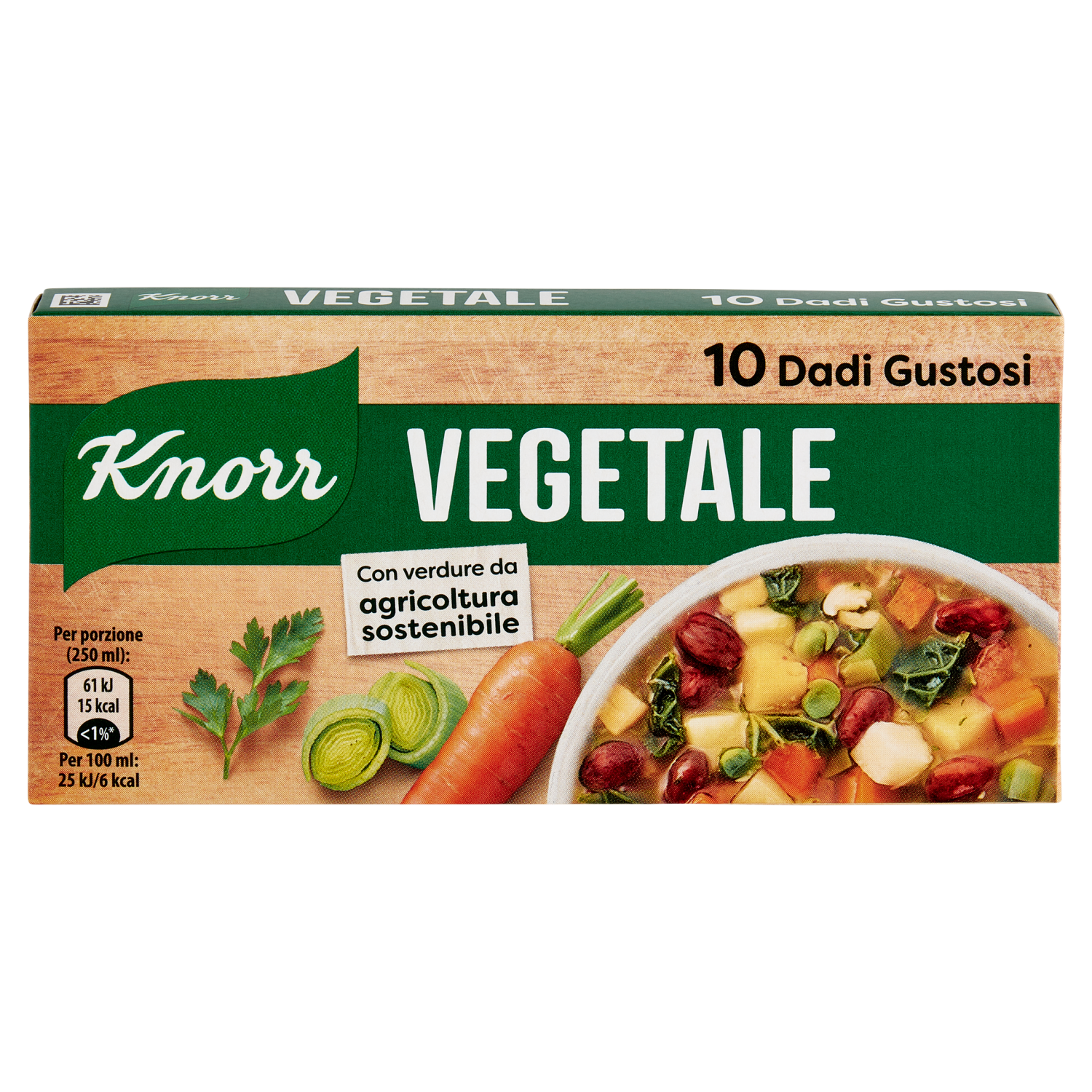 Ricetta consigliata: Minestrone Versa 1 cucchiaio di olio in una pentola, aggiungi 80g di carote, 60g di sedano, 80g di cipolla e 150g di porro e fai soffriggere per 10 minuti. Aggiungi quindi 200g di fagioli borlotti, 200g di piselli, 200g di cavolo, 350g di pomodori, 130g di zucchine, 330g di patate il tutto tagliato a cubetti. Versa quindi acqua fino a coprire, un dado vegetale Knorr e cuoci per 20 minuti dal bollore.