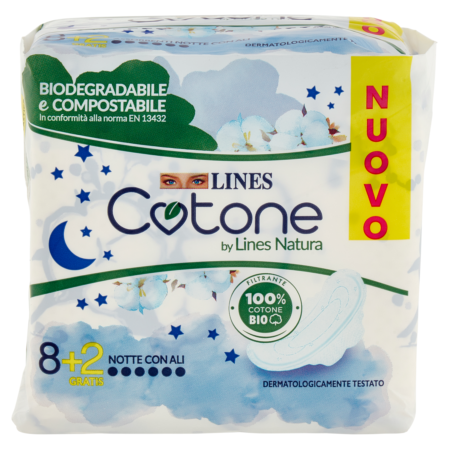 100% Cotone bio sulla pelle Filtrante in cotone per esaltare la sensazione di delicatezza sulla pelle. 100% Assorbenza Lines Cuore in cellulosa biologica certificata, per garantirti tutta l'assorbenza Lines. Novità Biodegradabile e compostabile Grazie all'utilizzo di materie prime certificate e di origine naturale, il nuovo assorbente Lines Cotone è biodegradabile e compostabile. Prodotto biodegradabile e compostabile** con materie prime di origine naturale certificate Si disintegra** in meno di 90 giorni*** Umido /Organico Fare una raccolta differenziata fa bene all'ambiente ***Se trattato in un impianto di compostaggio **In conformità alla norma EN 13432