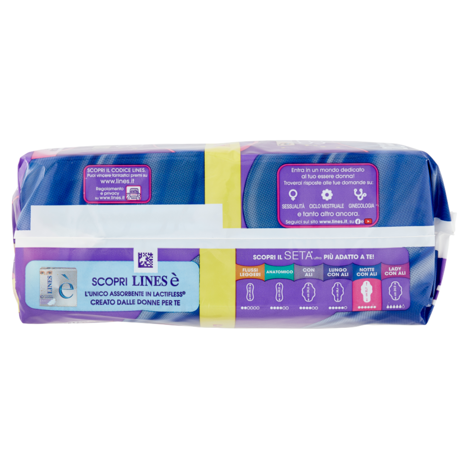 Scopri Lines è L'unico assorbente in Lactifless creato dalle donne per te Scopri il Seta ultra Più Adatto a Te! Flussi leggeri - cm 20,5 - Assorbenza 2 su 6 Anatomico - cm 24,0 - Assorbenza 4 su 6 Con ali - cm 24,0 - Assorbenza 4 su 6 Lungo con ali - cm 28,4 - Assorbenza 5 su 6 Notte con ali - cm 31,7 - Assorbenza 6 su 6 Lady con ali - cm 24,0 - Assorbenza 5 su 6 Entra in un mondo dedicato al tuo essere donna! Troverai risposte alle tue domande su: Sessualità - Ciclo mestruale - Ginecologia e tanto altro ancora. Seguici sul sito www.lines.it, su Facebook e YouTube