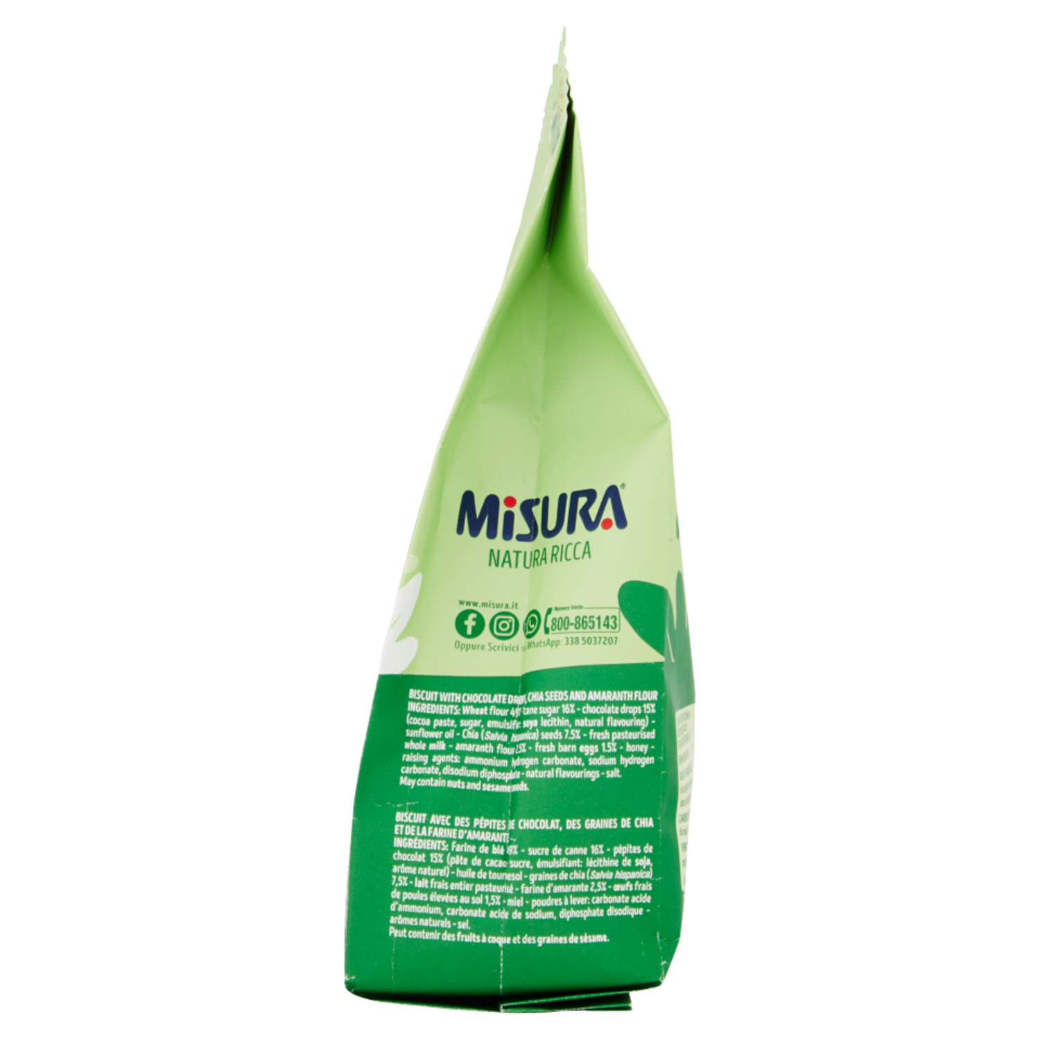 Tante golose gocce di cioccolato in una gustosa frolla impreziosita dalla farina di amaranto e dai semi di chia... un gusto ricco e naturale! L'ALA (Acido Alfa-Linoleico) è un tipo di Omega-3 e contribuisce al mantenimento di livelli normali di colesterolo nel sangue.* *L'effetto benefico si ottiene con l'assunzione giornaliera di 2g di ALA, nell'ambito di una dieta varia ed equilibrata e di uno stile di vita sano. Nessun Segreto, il buono è tutto qui! Ricchi in fibre Con farina tipo 2 Con zucchero grezzo di canna Senza sciroppo di glucosio Con uova fresche italiane da galline allevate a terra Senza grassi idrogenati Senza additivi conservanti e coloranti Senza olio di palma Ricette buone, semplici e trasparenti