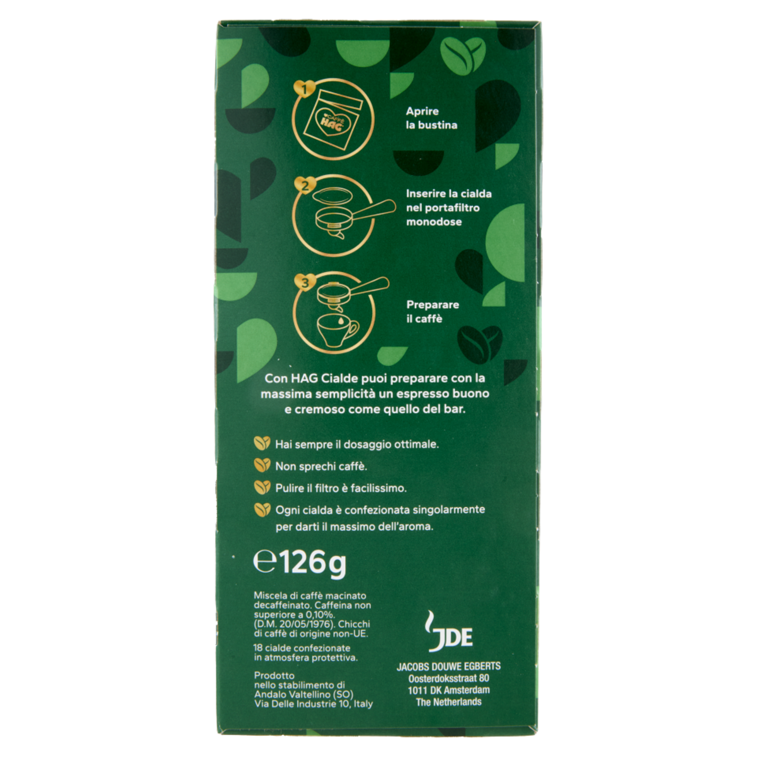 Capsule compatibili con macchine Nespresso* Original *marchio di terzi senza alcun collegamento con Jacobs Douwe Egberts. Con HAG Cialde puoi preparare con la massima semplicità un espresso buono e cremoso come quello del bar. - Hai sempre il dosaggio ottimale. - Non sprechi caffè. - Pulire il filtro è facilissimo. - Ogni cialda è confezionata singolarmente per darti il massimo dell'aroma.