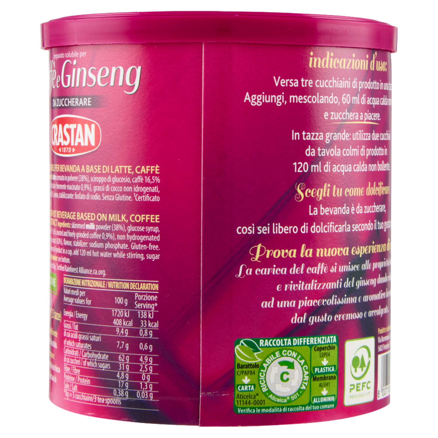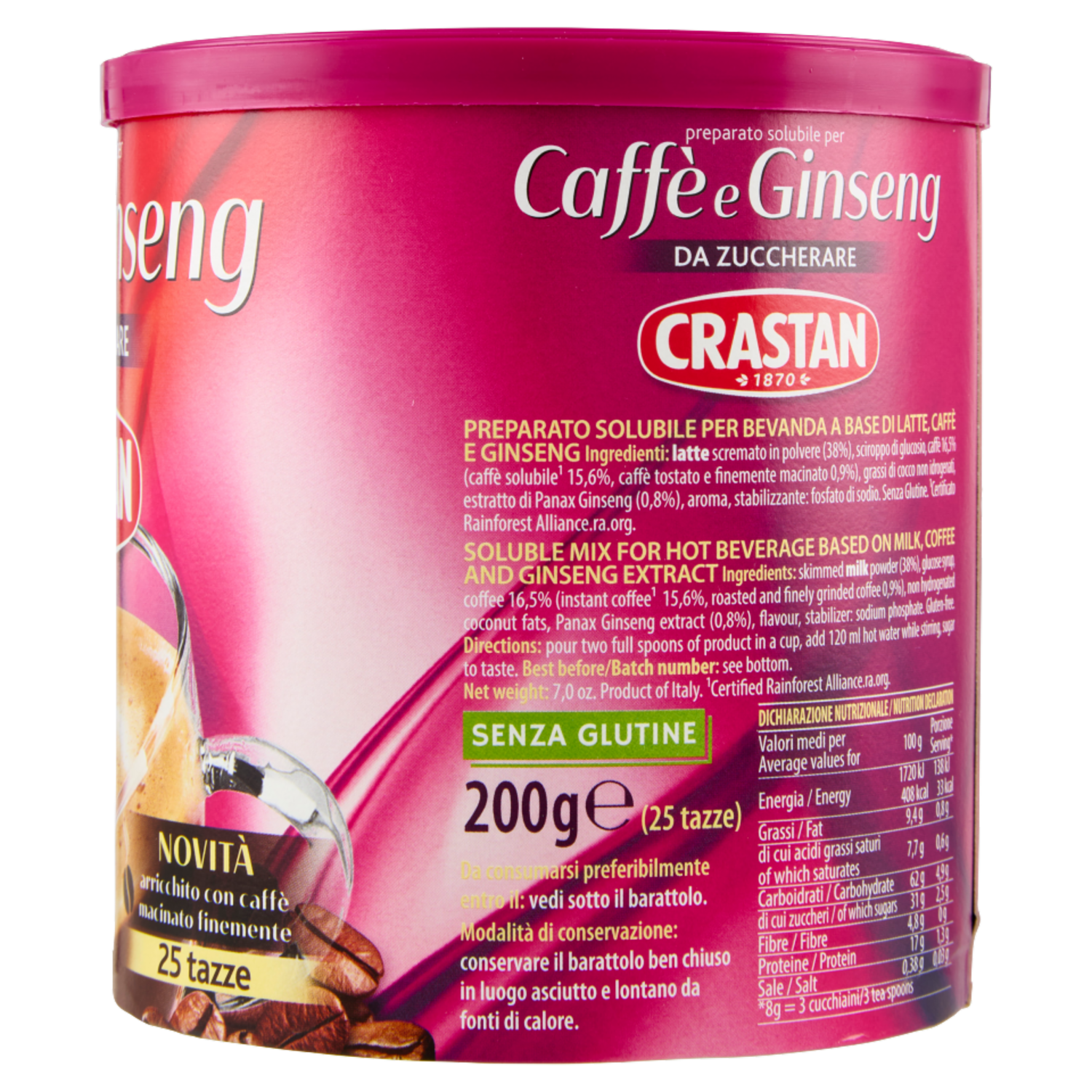 Prova la nuova esperienza di gusto La carica del caffè si unisce alle proprietà tonificanti e rivitalizzanti del ginseng dando vita ad una piacevolissima e aromatica bevanda dal gusto cremoso e avvolgente. Senza glutine
