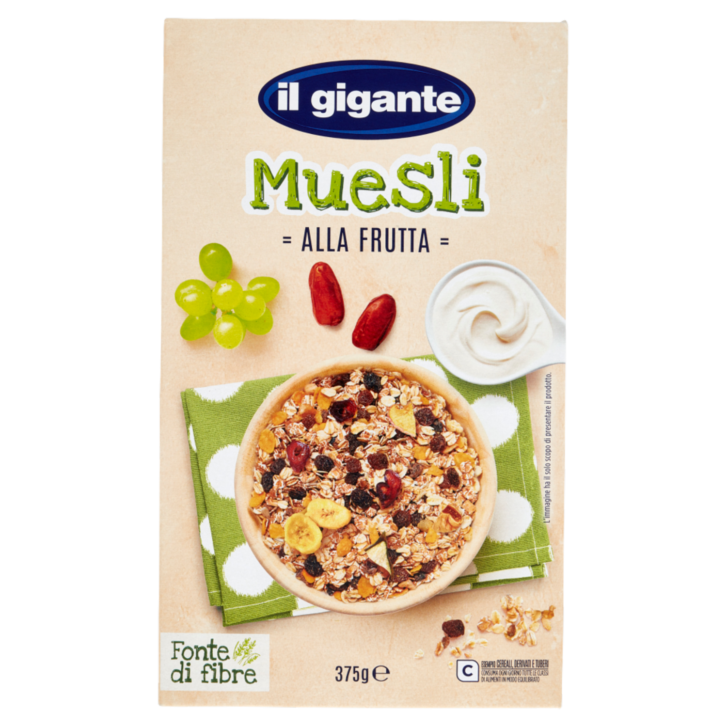 Modalità di preparazione Il Muesli alla Frutta Il Gigante è ideale per la tua colazione: unisci 3 o 4 cucchiai di Muesli al latte freddo o caldo o allo yogurt per apprezzare la croccantezza dei cereali.