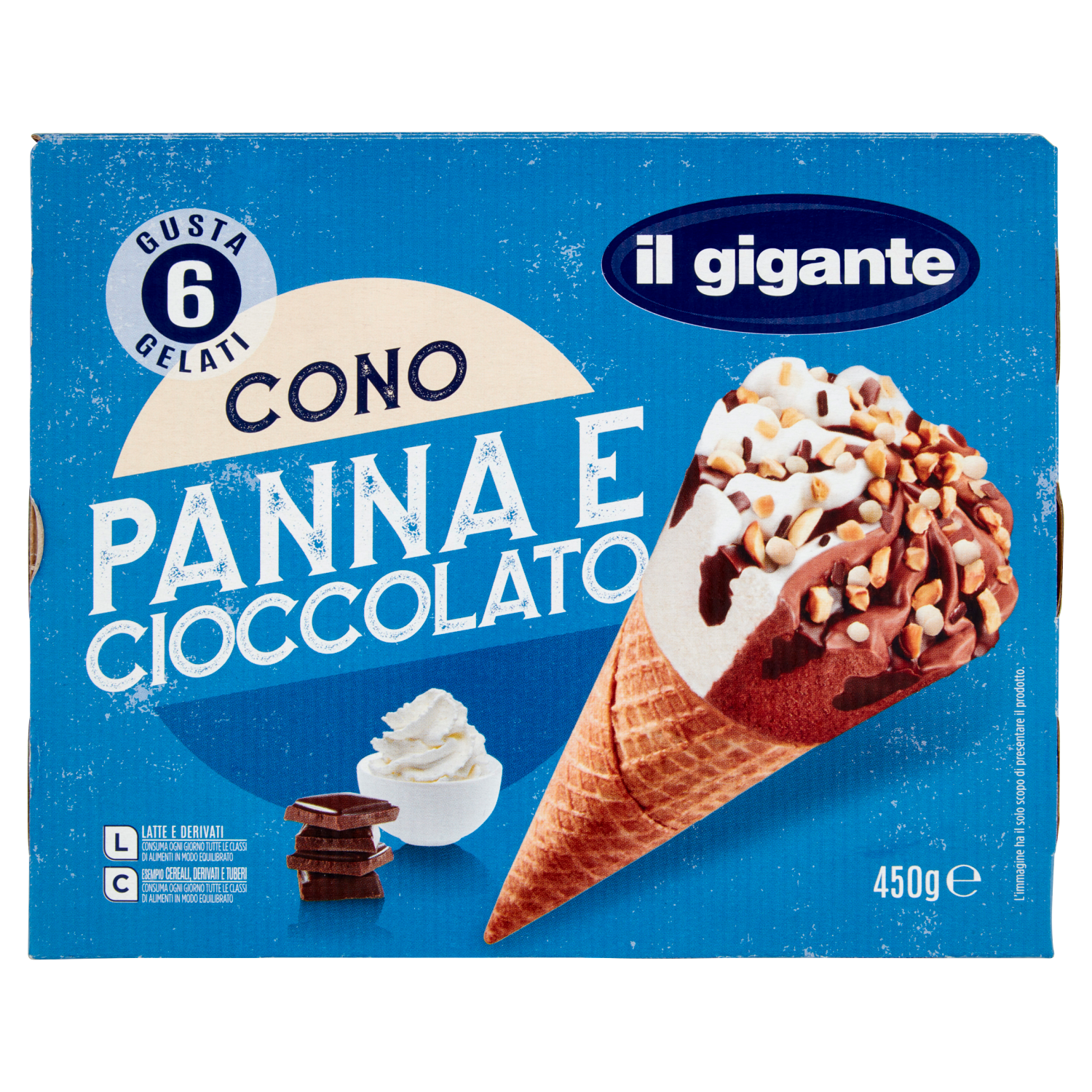6 Coni di gelato alla panna e al cioccolato in cialda con copertura al cacao magro, decorato con granella di nocciola tostata, meringhe e scaglietta di cioccolato fondente