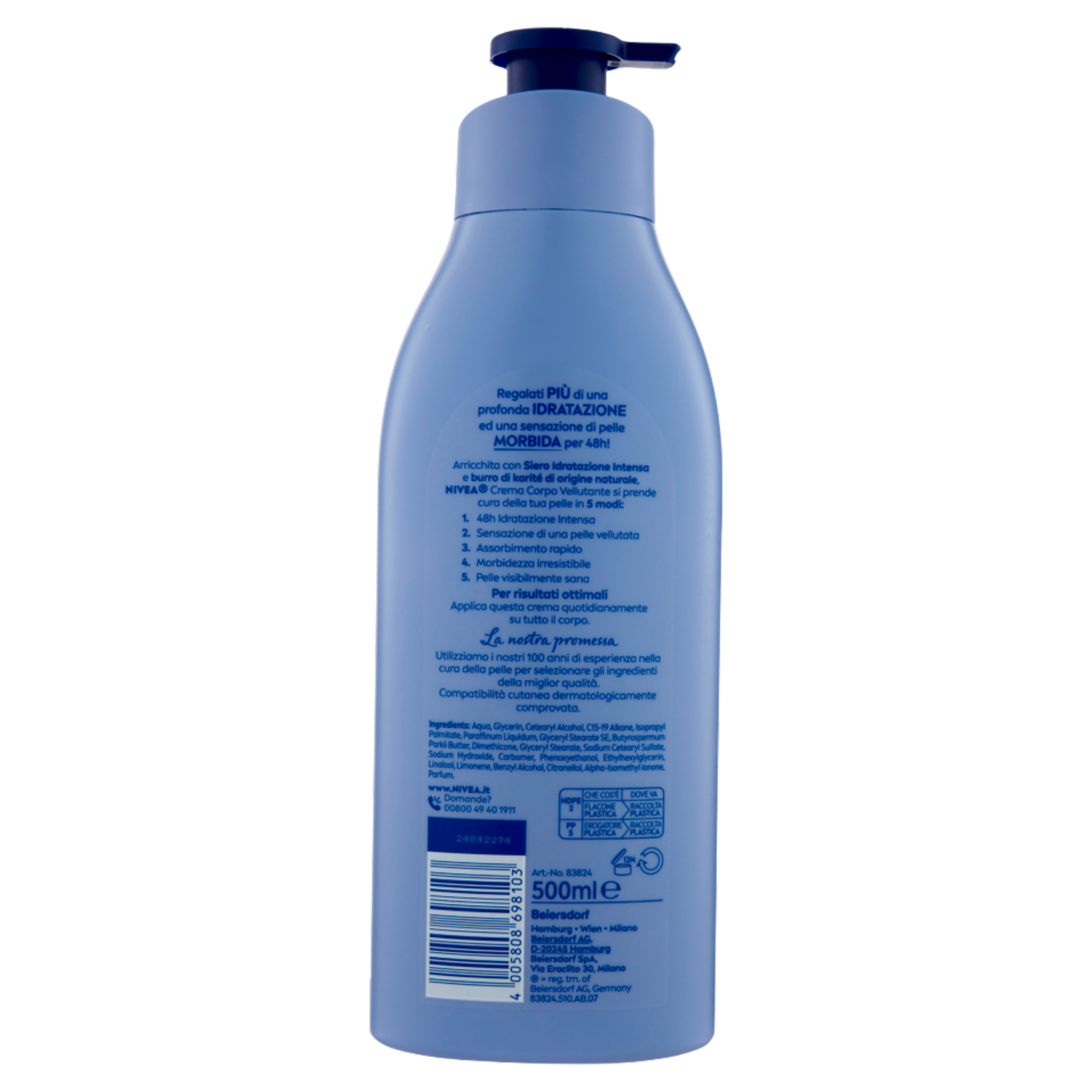 Regalati più di una profonda Idratazione ed una sensazione di pelle Morbida per 48h! Arricchita con Siero Idratazione Intensa e burro di karité di origine naturale, Nivea Crema Corpo Vellutante si prende cura della tua pelle in 5 modi: 1. 48h Idratazione Intensa 2. Sensazione di una pelle vellutata 3. Assorbimento rapido 4. Morbidezza irresistibile 5. Pelle visibilmente sana