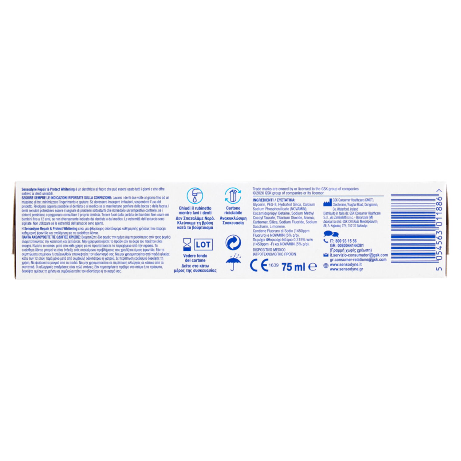 Sensodyne Repair & Protect Whitening, con la sua tecnologia Novamin, ha una formulazione a base di calcio clinicamente provata. Aiuta a riparare in profondità le aree sensibili dei denti, utilizzando le stesse sostanze di cui sono fatti. Dona sollievo dalla sensibilità dentale, per aiutarti a godere di ogni attimo senza la preoccupazione dei denti sensibili. Inoltre aiuta a restituire il bianco naturale dei tuoi denti e a prevenire le macchie. Dentifricio quotidiano con fluoro che offre sollievo duraturo dalla sensibilità dentale, mentre aiuta a mantenere i tuoi denti e le tue gengive sane.* *utilizzato due volte al giorno Sensodyne Repair & Protect Whitening è un dentifricio al fluoro che può essere usato tutti i giorni e che offre sollievo ai denti sensibili. Chiudi il rubinetto mentre lavi i denti Cartone riciclabile