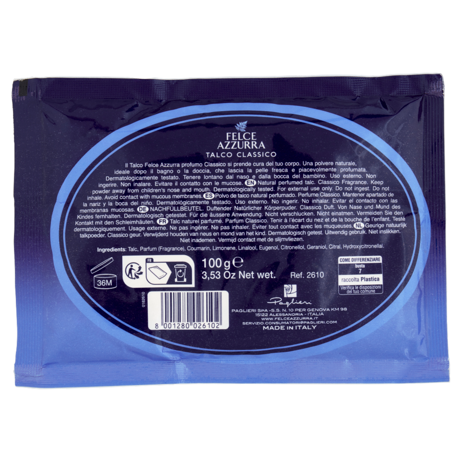 Felce Azzurra Talco Classico Il Talco Felce Azzurra profumo Classico si prende cura del tuo corpo. Una polvere naturale, ideale dopo il bagno o la doccia, che lascia la pelle fresca e piacevolmente profumata. Dermatologicamente testato.