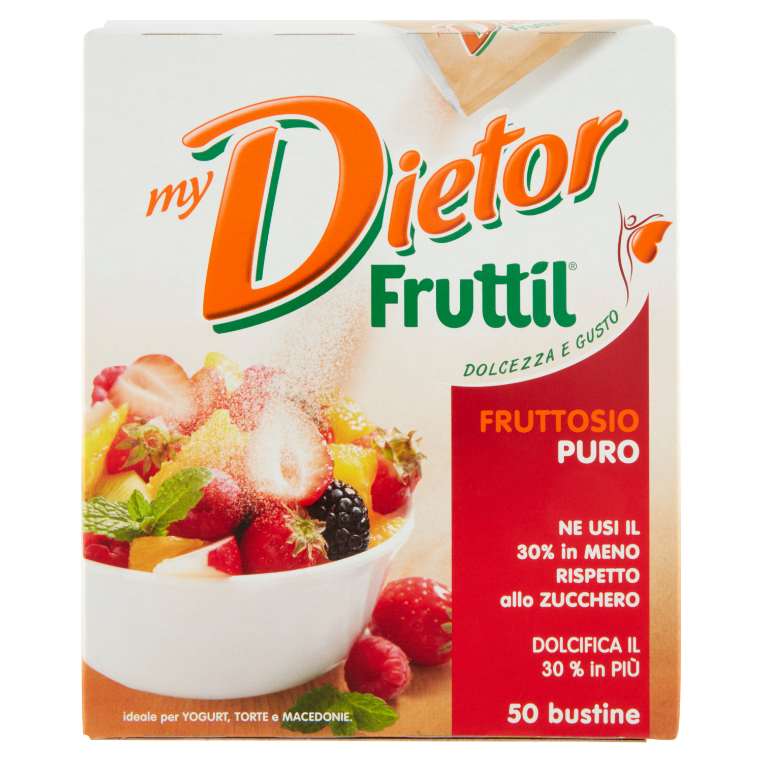 Fruttosio puro cristallino Il fruttosio è lo zucchero di cui sono particolarmente ricchi la frutta matura ed il miele. Il suo sapore delicato esalta ed arricchisce il gusto e l'aroma degli alimenti a cui viene aggiunto. Ideale per Bevande calde o fredde come caffè, thé, latte ed infusi, dolci e torte, macedonie di frutta fresca Fruttil è ottenuto con uno specifico processo di lavorazione, attentamente controllato in ogni sua fase, che ne garantisce un elevato livello di qualità e purezza. Ha un potere dolcificante superiore rispetto allo zucchero: infatti a parità di peso dolcifica il 30% in più. Ciò permette di utilizzarne minori quantità a parità di dolcificazione 1 bustina da 4 g di Fruttil = 16 kcal (68 kJ) (400 kcal/1700 kJ per 100 g Fruttil) dolcifica come 1 bustina da 6 g di zucchero = 24 kcal (102 kJ) (400 kcal/1700 kJ per 100 g zucchero)