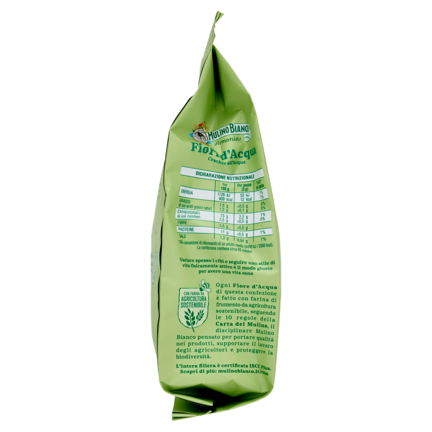 Cracker all'Acqua croccanti e senza lievito, buoni con tutto, sempre. - 40% di Grassi" fonte di Fibre Senza lieviti *rispetto alla media dei cracker più venduti Fonte Unione Italiana Food - per maggiori informazioni: mulinobianco.it Variare spesso i cibi e seguire uno stile di vita fisicamente attivo è il modo giusto per avere una vita sana Con farina da agricoltura sostenibile Ogni Fiore d'Acqua di questa confezione è fatto con farina di frumento da agricoltura sostenibile, seguendo le 10 regole della Carta del Mulino, il disciplinare Mulino Bianco pensato per portare qualità nei prodotti, supportare il lavoro degli agricoltori e proteggere la biodiversità. L'intera filiera è certificata ISCC Plus. Scopri di più: mulinobianco.it/cdm