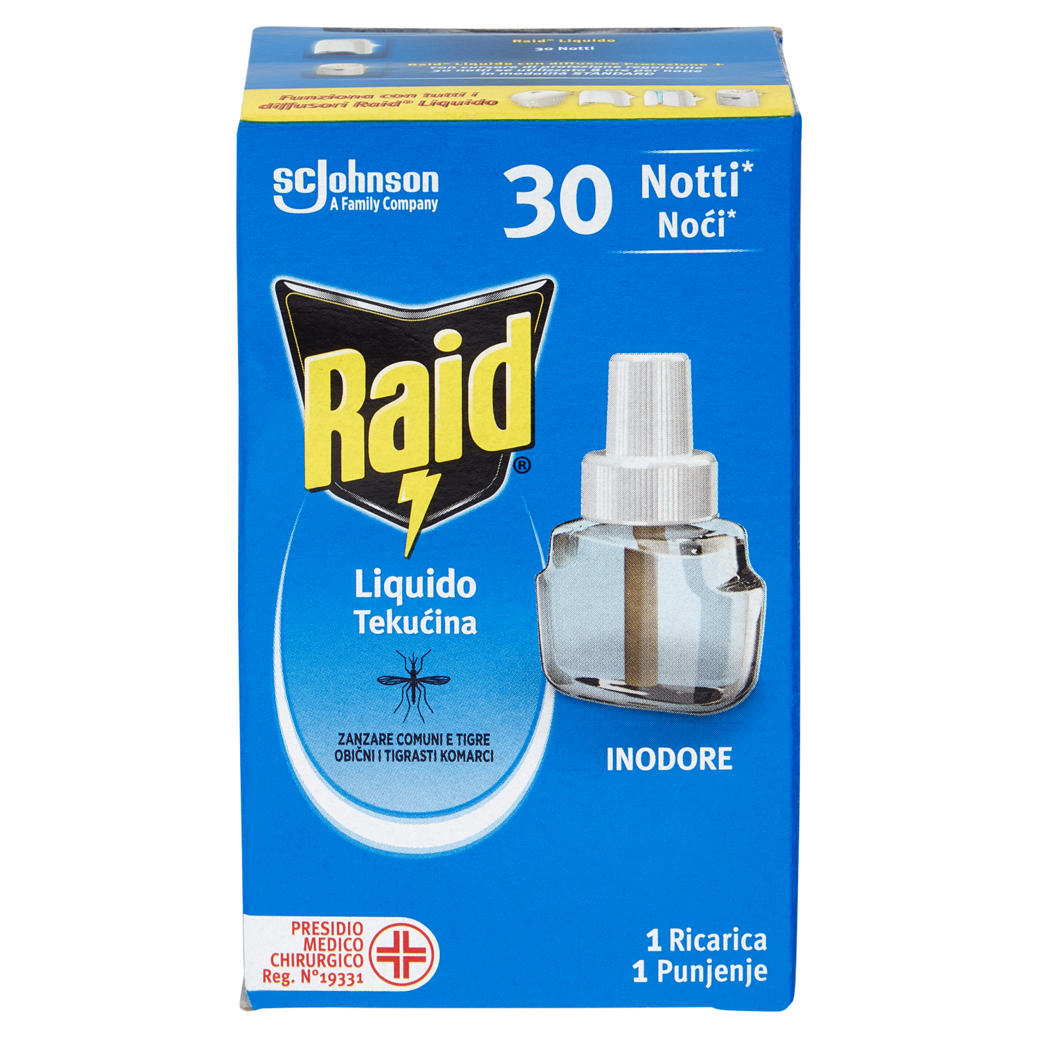 Raid Liquido offre 30 notti (8 ore per notte) di efficacia costante per tutta la notte contro le zanzare tigre (Aedes albopictus) e zanzare comuni (Culex pipiens), anche a luci accese. Raid Liquido offre una protezione continua e discreta. Raid Liquido protegge una stanza di 20 m³. Raid Liquido 30 Notti Raid Liquido con diffusore Protezione+ con cursore di protezione regolabile 30 notti se utilizzato 8 ore per notte in modalità Standard Funziona con tutti i diffusori Raid Liquido