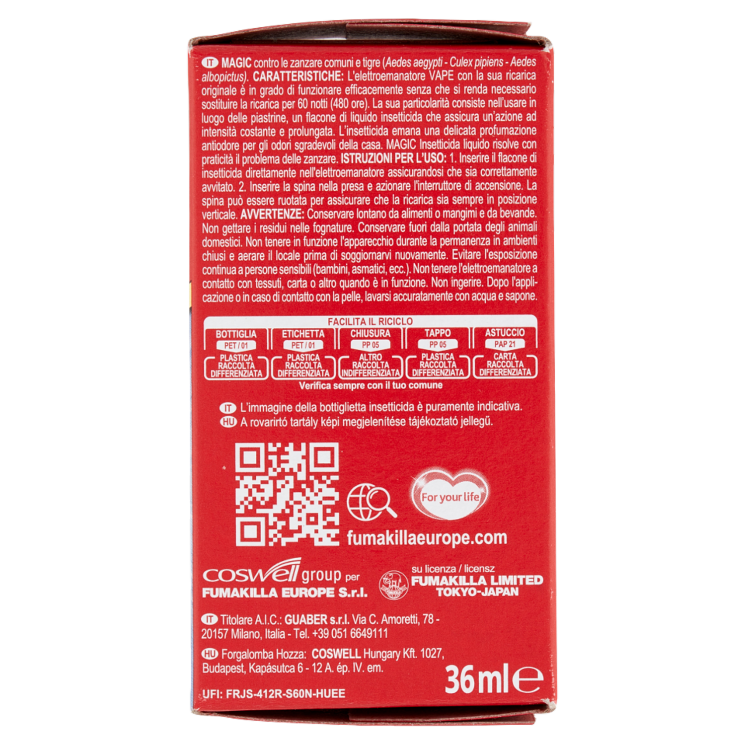 Magic contro le zanzare comuni e tigre (Aedes aegypti - Culex pipiens - Aedes albopictus). Caratteristiche: L'elettroemanatore Vape con la sua ricarica originale è in grado di funzionare efficacemente senza che si renda necessario sostituire la ricarica per 60 notti (480 ore). La sua particolarità consiste nell'usare in luogo delle piastrine, un flacone di liquido insetticida che assicura un'azione ad intensità costante e prolungata. L'insetticida emana una delicata profumazione antiodore per gli odori sgradevoli della casa. Magic Insetticida liquido risolve con praticità il problema delle zanzare.