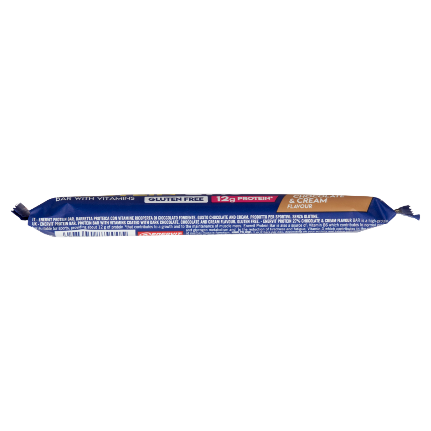 Enervit Protein Bar. Barretta proteica con vitamine ricoperta di cioccolato fondente. Gusto chocolate and cream. Prodotto per sportivi. Senza glutine