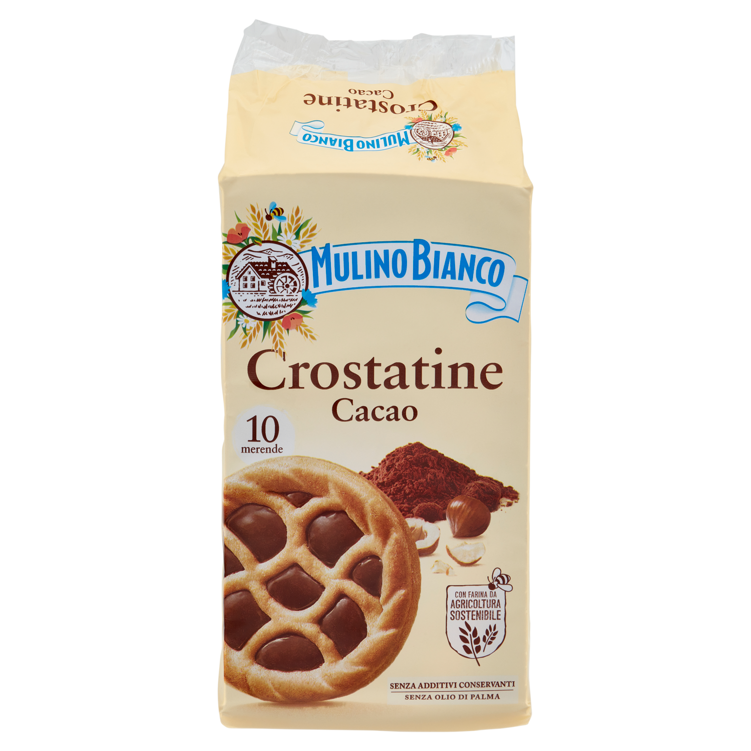 1 Crostatina Cacao + 1 tazza di thè senza zucchero (200ml) apportano circa 781 kJ/187 kcal pari al 9% dell'assunzione energetica di riferimento giornaliera di un adulto medio (8400 kJ/2000 kcal). La Carta del Mulino Con farina da agricoltura sostenibile Ogni Crostatina di questa confezione è fatta con Farina di frumento da Agricoltura Sostenibile rispettando le 10 regole della Carta del Mulino. La Carta del Mulino è il nostro disciplinare per la coltivazione sostenibile del grano tenero redatto insieme al WWF. Porta qualità nei prodotti, supporta il lavoro della comunità di agricoltori e protegge la biodiversità favorendo anche gli insetti impollinatori. Insieme per un grano tenero sostenibile La Carta del Mulino prevede il rispetto dei criteri di sostenibilità ISCC Plus ed è stata scritta insieme al WWF e al Dipartimento di Scienze e Tecnologie Agro-Alimentari dell'Alma Mater Studiorum - Università di Bologna. La regola n.3 della Carta del Mulino prevede di riservare il 3% dei campi di grano tenero ai fiori, scopri le altre regole su mulinobianco.it/lacartadelmulino