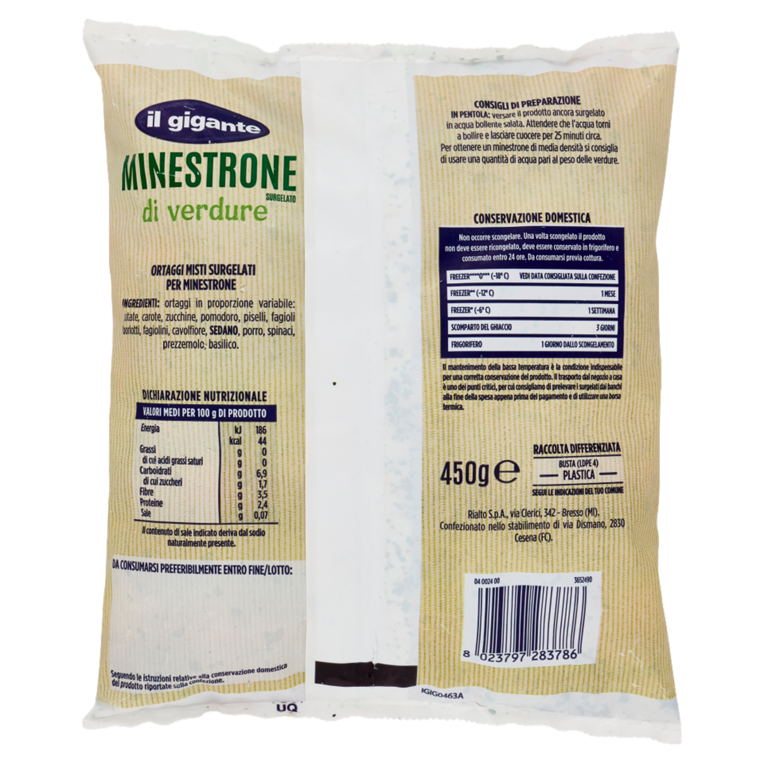 Modalità di preparazione In pentola Versare il prodotto ancora surgelato in acqua bollente salata. Attendere che l'acqua torni a bollire e lasciare cuocere per 25 minuti circa. Per ottenere un minestrone di media densità si consiglia di usare una quantità di acqua pari al peso delle verdure.