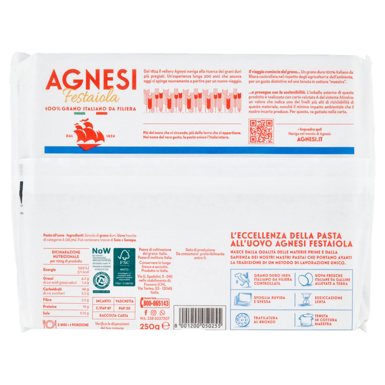 Agnesi Dal 1824 Dal 1824 il veliero Agnesi naviga alla ricerca dei grani duri più pregiati. Un'esperienza lunga 200 anni che ancora oggi ci spinge nuovamente a partire per un nuovo viaggio. Più del mare che ci circonda, più della terra che ci appartiene. Nel nome del vero gusto, la pasta unisce l'Italia intera. L'eccellenza della pasta all'uovo Agnesi Festaiola Nasce dalla qualità delle materie prime e dalla sapienza dei nostri mastri pastai che portano avanti la tradizione di un metodo di lavorazione unico. Grano duro 100% italiano da filiera controllata Uova fresche italiane da galline allevate a terra Sfoglia ruvida e spessa Essiccazione lenta Trafilatura al bronzo Tenuta in cottura maestra Naviga nel mondo di Agnesi. agnesi.it