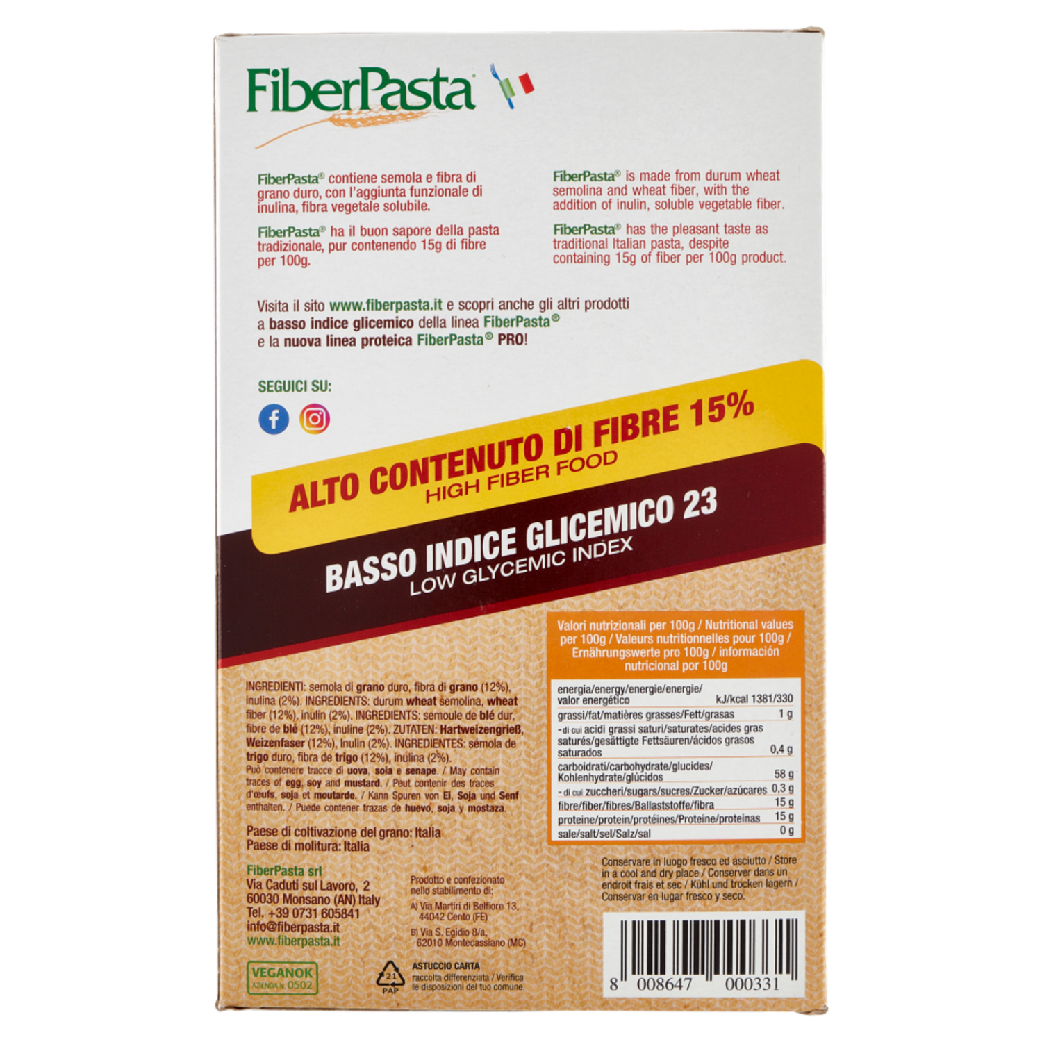 FiberPasta srl Via Caduti sul Lavoro, 2 60030 Monsano (AN) Italy Prodotto e confezionato nello stabilimento di: A) Via Martiri di Belfiore 13, 44042 Cento (FE) B) Via S. Egidio 8/a, 62010 Montecassiano (MC)