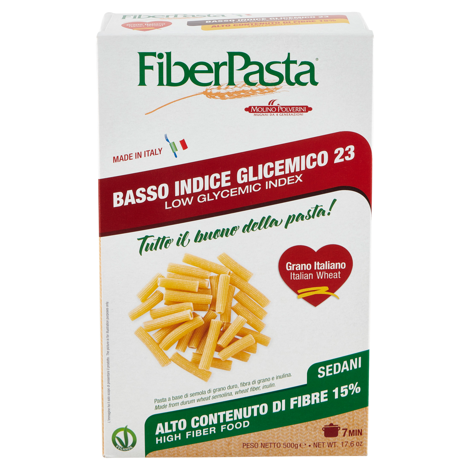 FiberPasta contiene semola e fibra di grano duro, con l'aggiunta funzionale di inulina, fibra vegetale solubile. FiberPasta ha il buon sapore della pasta tradizionale, pur contenendo 15g di fibre per 100g.