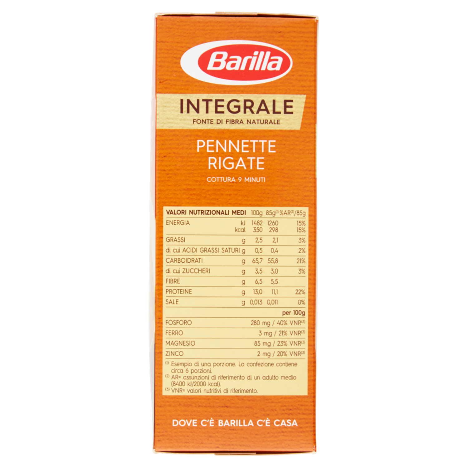 Pennette Rigate Barilla: Bontà Integrale Tutta la bontà della pasta Barilla con il benessere delle fibre. Una porzione di pasta Barilla Integrale (85g) fornisce infatti più del 20% del tuo fabbisogno giornaliero di fibre. L'inconfondibile colore dorato è frutto della semola integrale ottenuta con l'esclusivo metodo di macinazione Barilla e la sua perfetta consistenza è studiata per portare in tavola ogni giorno il massimo del gusto. Buon Appetito! Scopri di più su www.barilla.com