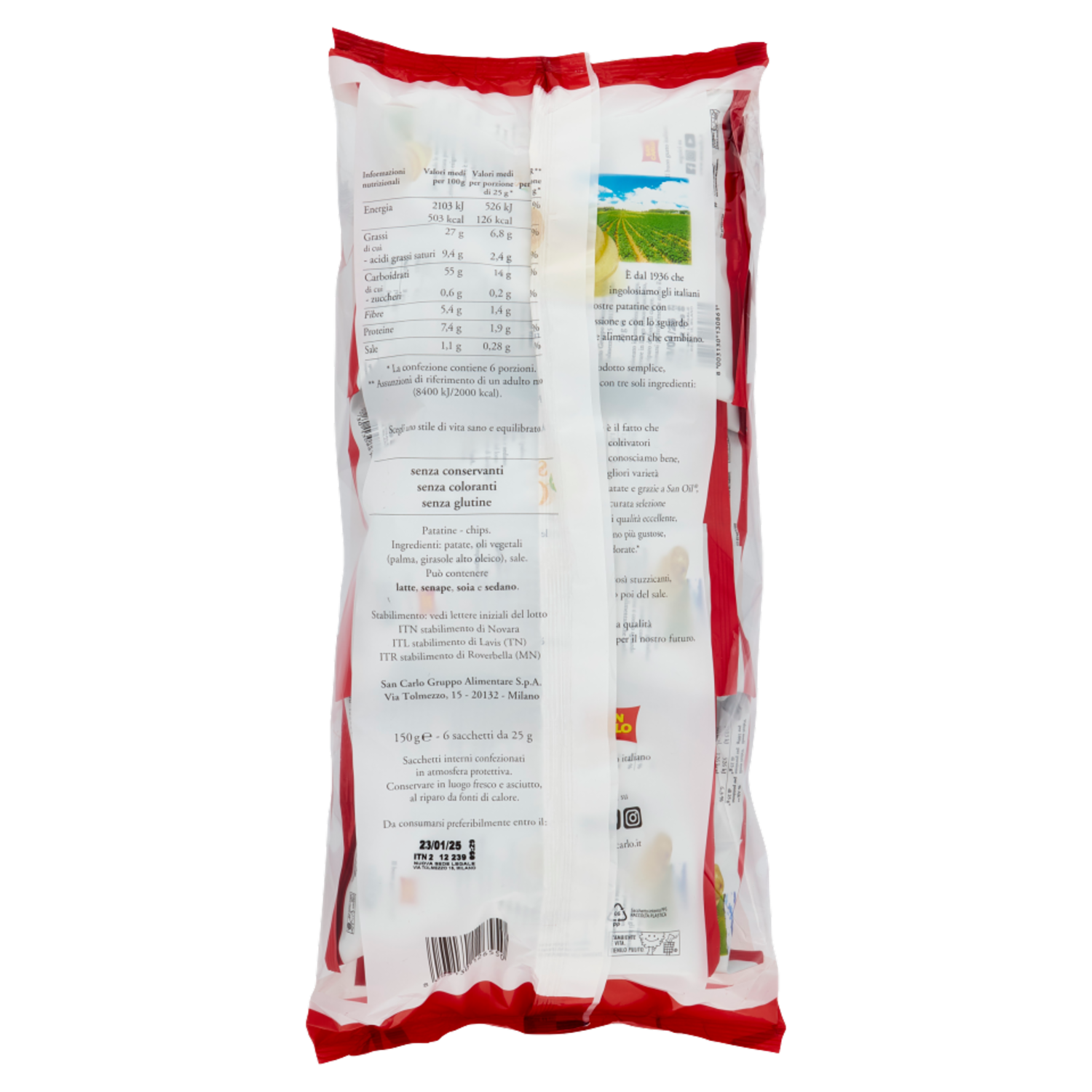 San Carlo Il buon gusto italiano È dal 1936 che ingolosiamo gli italiani preparando le nostre patatine con immutata passione e con lo sguardo rivolto alle esigenze alimentari che cambiano. Il nostro è un prodotto semplice, perché fatto con tre soli ingredienti: patate, olio e sale. A renderlo speciale è il fatto che scegliamo solo i coltivatori che conosciamo bene, le migliori varietà di patate e grazie a San Oil, un'accurata selezione di oli vegetali di qualità eccellente, le nostre patatine sono più gustose, croccanti e dorate.* E per renderle così stuzzicanti, aggiungiamo poi del sale. Per noi la qualità è impegno costante per il nostro futuro. seguici su Facebook, YouTube, Instagram www.sancarlo.it