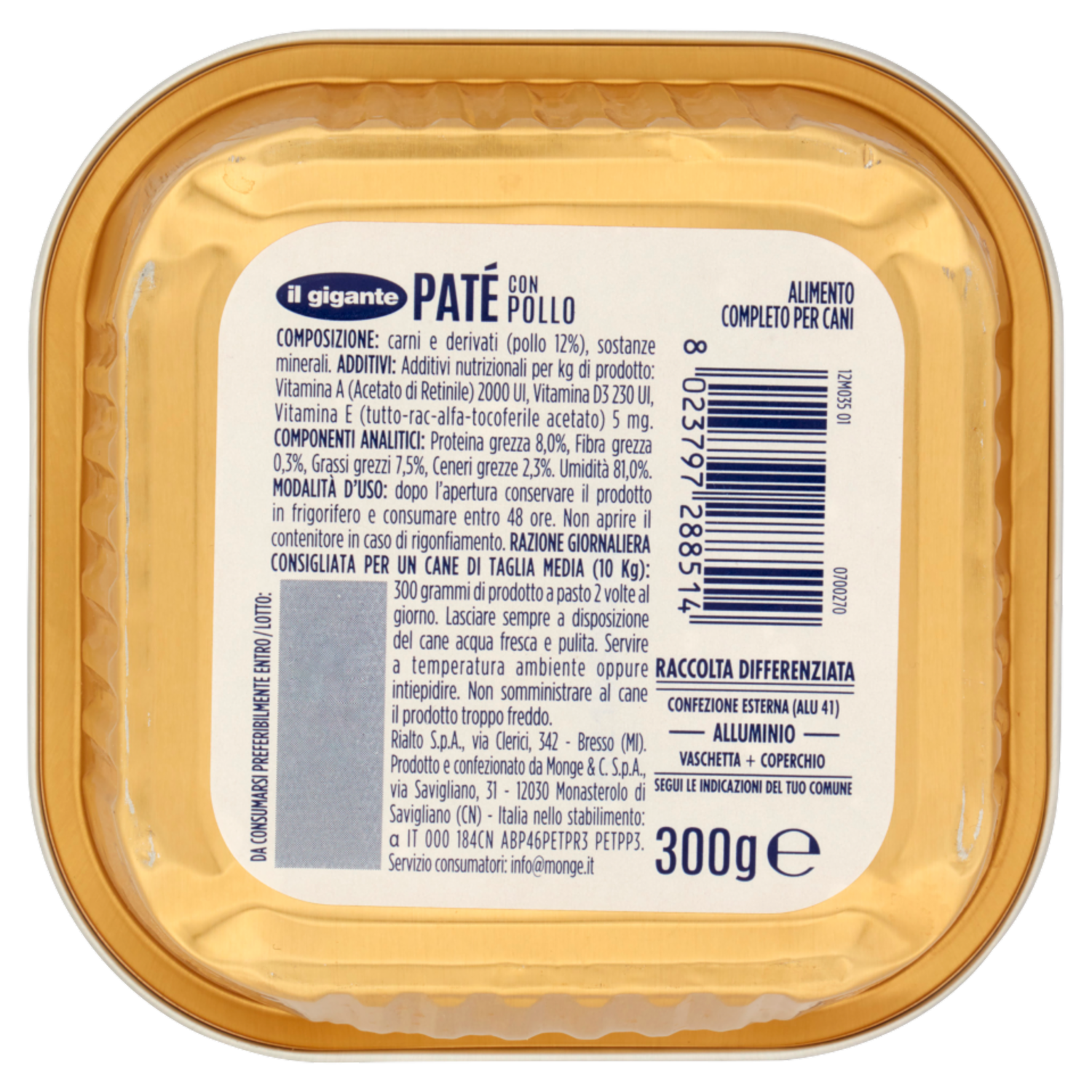 Rialto S.p.A. via Clerici, 342 Bresso (MI) Prodotto e confezionato da Monge & C. S.p.A. via Savigliano, 31 12030 Monasterolo di Savigliano (CN) Italia nello stabilimento: α IT 000 184CN ABP46PETPR3 PETPP3