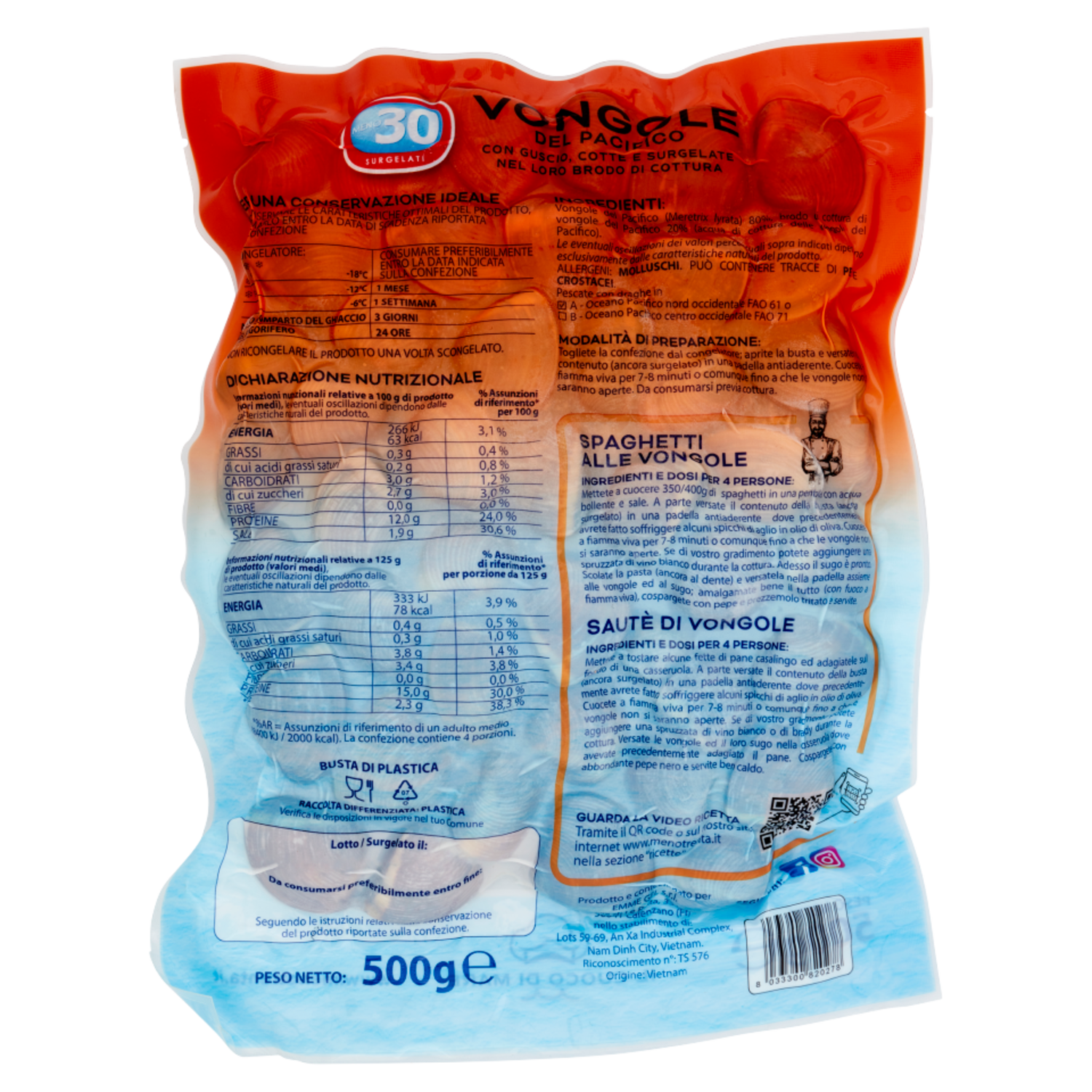 Spaghetti alle vongole Ingredienti e dosi per 4 persone: Mettete a cuocere 350/400g di spaghetti in una pentola con acqua bollente e sale. A parte versate il contenuto della busta (ancora surgelato) in una padella antiaderente dove precedentemente avrete fatto soffriggere alcuni spicchi di aglio in olio di oliva. Cuocete a fiamma viva per 7-8 minuti o comunque fino a che le vongole non si saranno aperte. Se di vostro gradimento potete aggiungere una spruzzata di vino bianco durante la cottura. Adesso il sugo è pronto. Scolate la pasta (ancora al dente) e versatela nella padella assieme alle vongole ed al sugo; amalgamate bene il tutto (con fuoco a fiamma viva), cospargete con pepe e prezzemolo tritato e servite. Sautè di vongole Ingredienti e dosi per 4 persone: Mettete a tostare alcune fette di pane casalingo ed adagiatele sul fondo di una casseruola. A parte versate il contenuto della busta (ancora surgelato) in una padella antiaderente dove precedentemente avrete fatto soffriggere alcuni spicchi di aglio in olio di oliva. Cuocete a fiamma viva per 7-8 minuti o comunque fino a che le vongole non si saranno aperte. Se di vostro gradimento potete aggiungere una spruzzata di vino bianco o di brandy durante la cottura. Versate le vongole ed il loro sugo nella casseruola dove avevate precedentemente adagiato il pane. Cospargete con abbondante pepe e servite ben caldo. Guarda la video ricetta tramite il QR code o sul nostro sito internet www.menotrenta.it nella sezione "ricette"