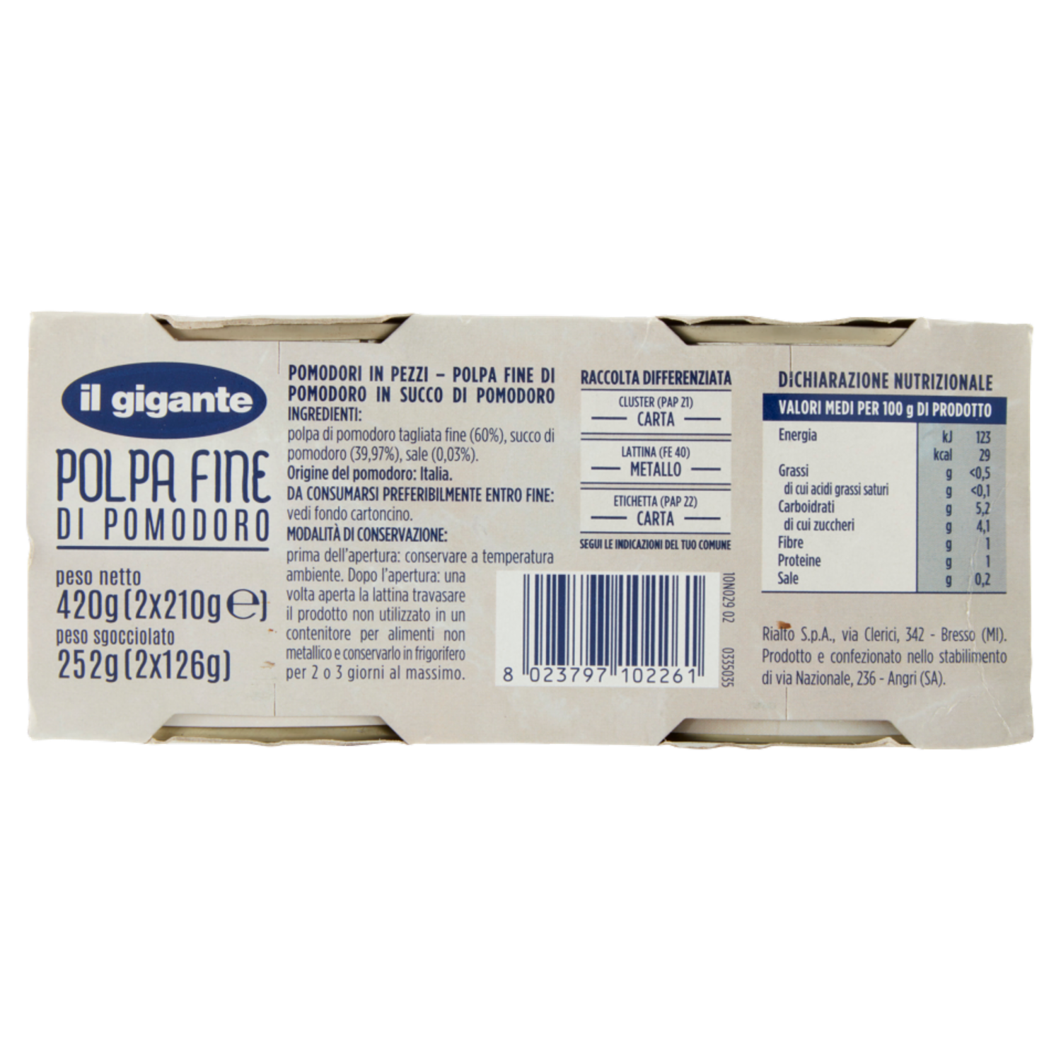 Rialto S.p.A. via Clerici, 342 Bresso (MI) Prodotto e confezionato nello stabilimento di via Nazionale, 236 Angri (SA)