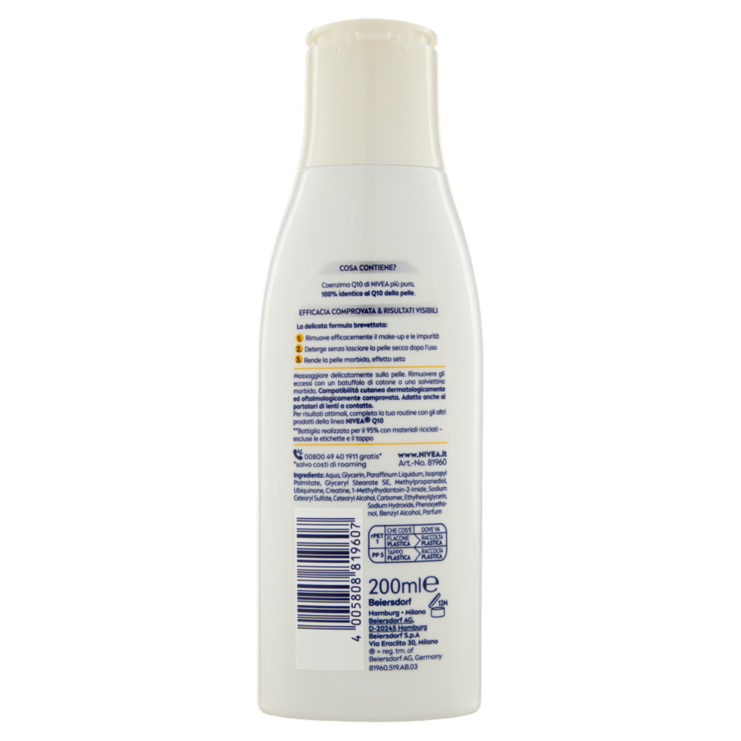 La naturale biologia della pelle e il Q10 Il Q10 è un coenzima naturalmente presente nelle cellule della pelle. È un autentico serbatoio di energia cellulare, la cui concentrazione però tende a diminuire con l'età, rendendo la pelle più incline ai segni del tempo. Nivea Q10 Power restituisce alla pelle il Q10 perso ad ogni applicazione. La formula contiene Coenzima Q10 100% identico al Q10 della pelle, potente antiossidante e naturale difesa anti-età della pelle, e Creatina che stimola la naturale produzione di collagene della pelle* Azioni del prodotto La formula brevettata rimuove delicatamente ma efficacemente il make-up e le impurità, per una pelle detersa e idratata. Massaggiare delicatamente sulla pelle. Rimuovere gli eccessi con un batuffolo di cotone o una salviettina morbida. Compatibilità cutanea dermatologicamente ed oftalmologicamente comprovata. Adatto anche alle pelli sensibili. *test in vitro