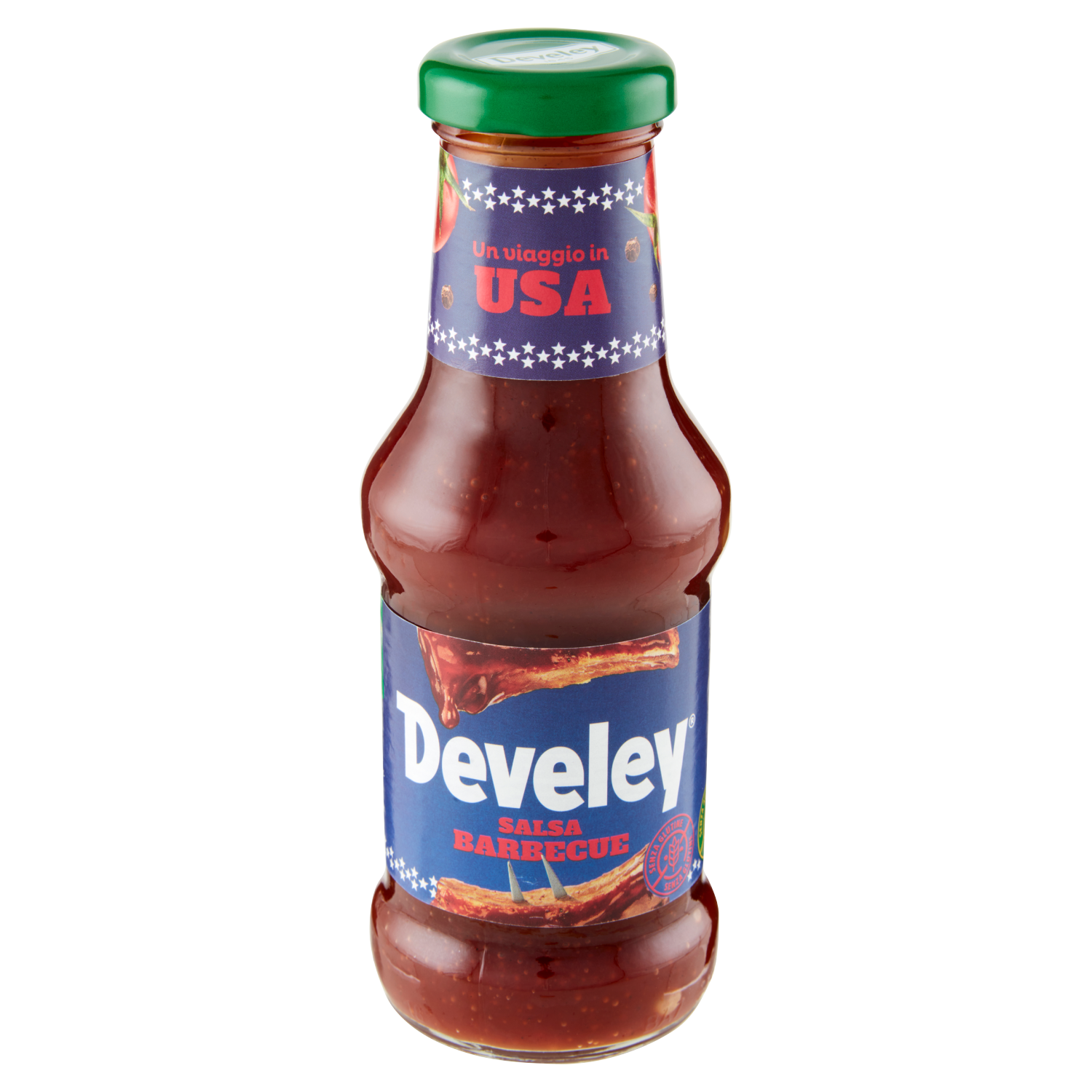 La Salsa Barbecue Develey, dal caratteristico aroma fumé, è particolarmente indicata per accompagnare carni alla griglia, costine e bistecche.