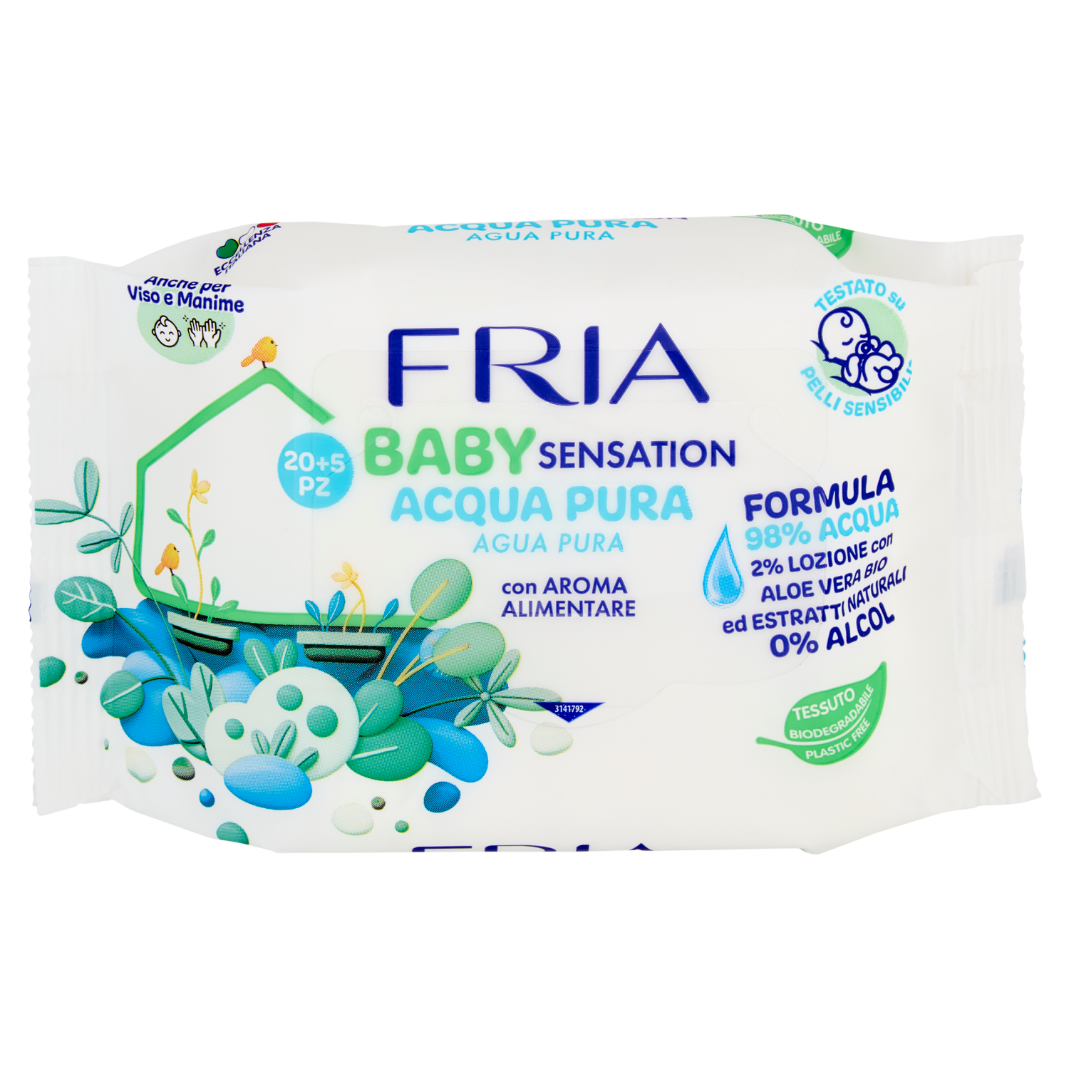 Il Prodotto Le nuove salviette Fria Baby Sensation con formula ad effetto Emolliente nascono dalla ricerca di un prodotto innovativo di altissima qualità, appositamente studiato per soddisfare le esigenze della delicata epidermide di neonati e bambini. La particolare formulazione con Burro di Karité lascia sulla pelle del bambino un sottile strato protettivo che dona morbidezza e non necessita l'aggiunta supplementare di creme o lozioni dopo la pulizia. Gli estratti glicerici di Camomilla e Calendula sono ottenuti da piante coltivate in regime di agricoltura biologica per garantire una sicurezza ancora maggiore di un prodotto delicato e ben tollerato. Comode ed utili in ogni momento della giornata, svolgono una completa e delicata azione igienica dell'epidermide senza alterare il naturale pH fisiologico del bambino durante il cambio del pannolino e risultano ideali anche nella detersione del viso e delle mani. Richiudere accuratamente la confezione dopo l'uso per preservare igiene ed umidificazione. L'Innovazione Nuovo tessuto naturesoft biodegradabile triplo strato - Fria sceglie di sostenere l'ambiente e dall'innovazione in ambito di materie prime nasce il Nuovo Tessuto Biodegradabile Naturesoft a Triplo Strato, frutto di una specifica ricerca volta a creare un tessuto senza plastica, particolarmente resistente e con una morbidezza che garantisce delicatezza nel momento dell'utilizzo. La Garanzia Formulazione dermatologicamente testata su pelli sensibili.