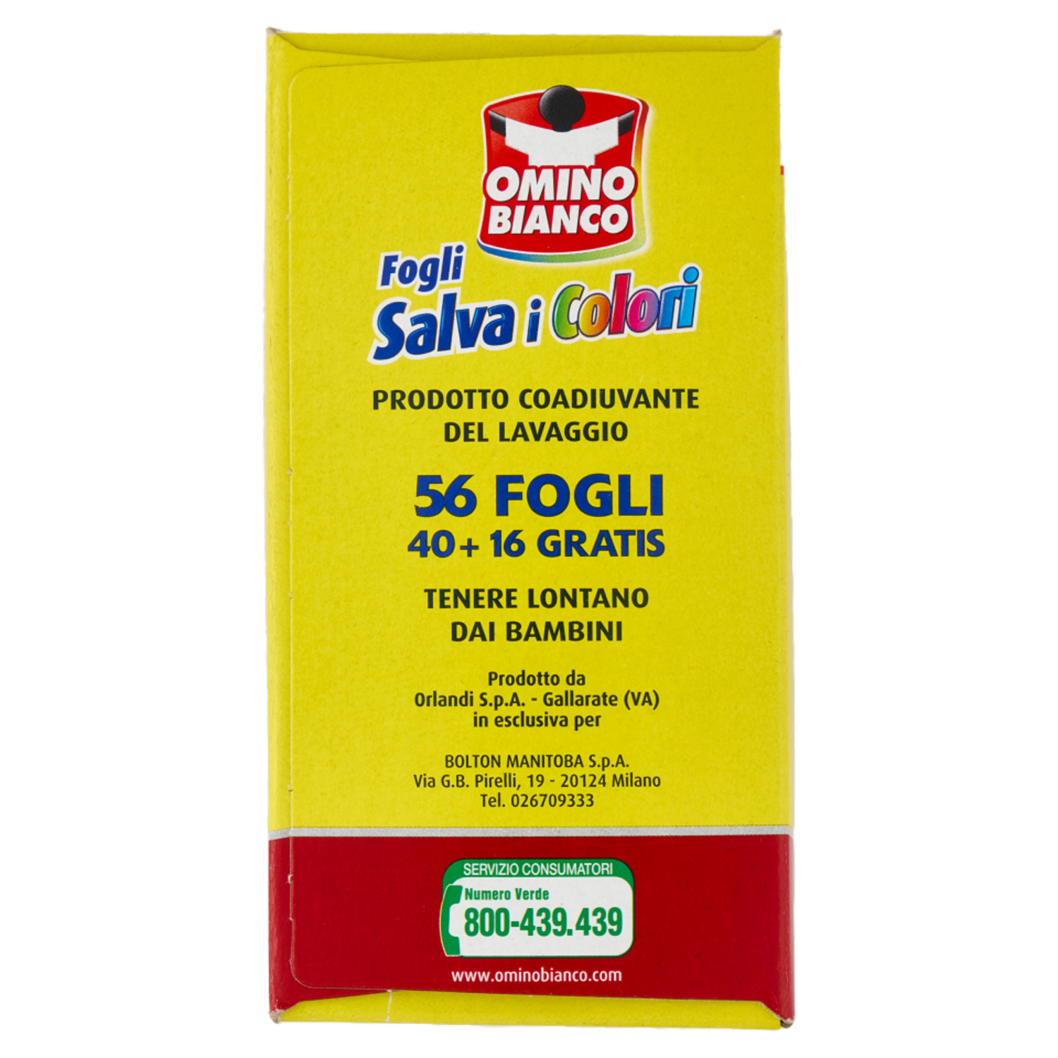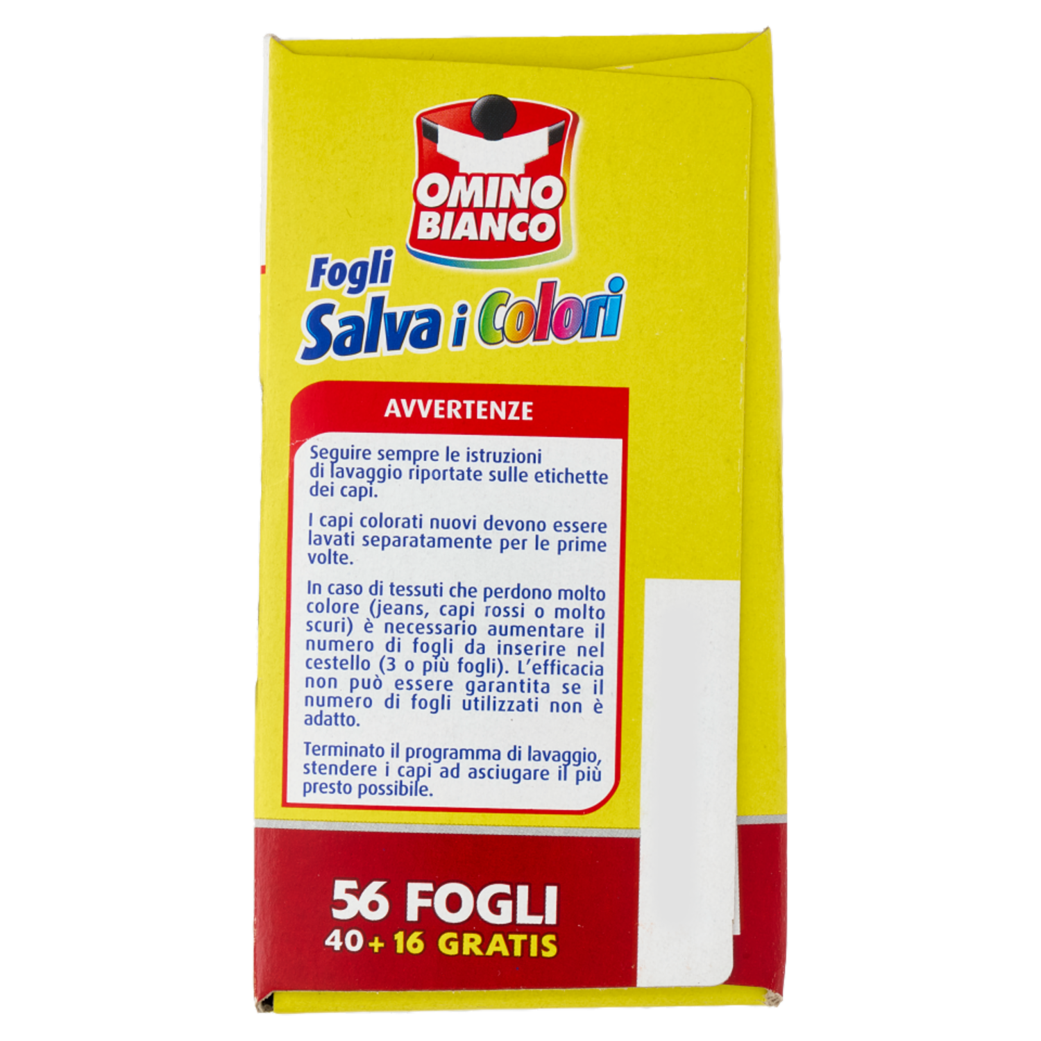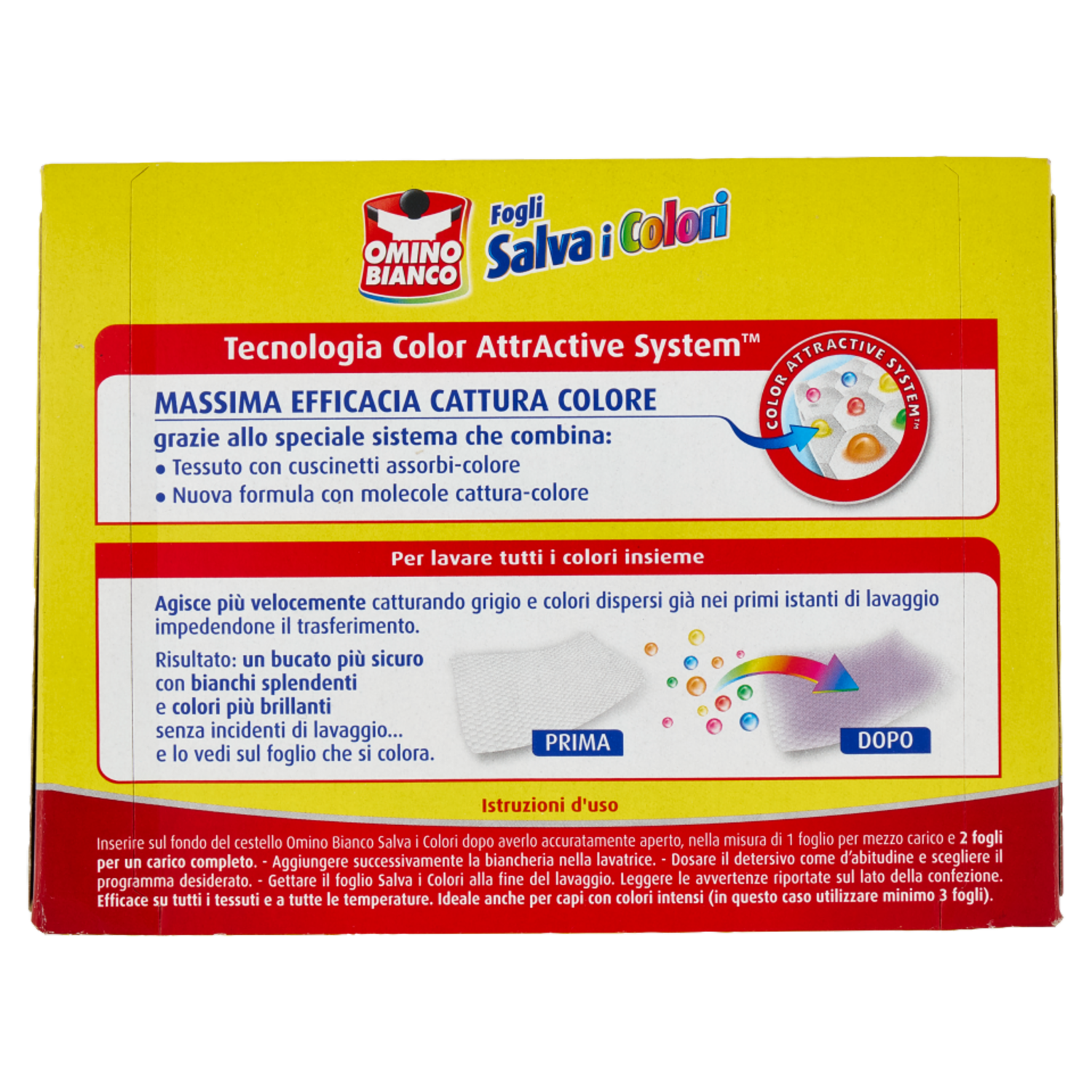 Istruzioni d'uso Inserire sul fondo del cestello Omino Bianco Salva i Colori dopo averlo accuratamente aperto, nella misure di 1 foglio per mezzo carico e 2 fogli per un carico completo. - Aggiungere successivamente la biancheria nella lavatrice. - Dosare il detersivo come d'abitudine e scegliere il programma desiderato. - Gettare il foglio Salva i Colori alla fine del lavaggio. Leggere le avvertenze riportate sul lato della confezione. Efficace su tutti i tessuti e a tutte le temperature. Ideale anche per capi con colori intensi (in questo caso utilizzare minimo 3 fogli.)