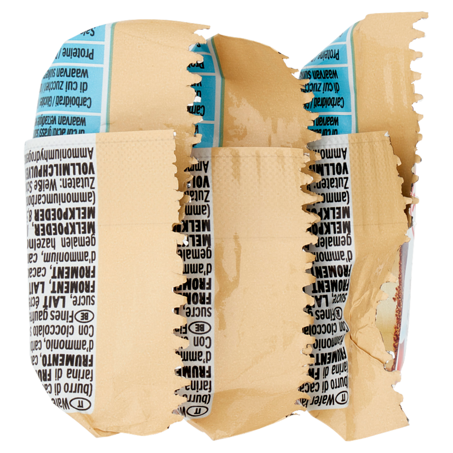 Wafer farcito al latte e nocciole ricoperto di cioccolato bianco, con granella al cacao (6,5%)