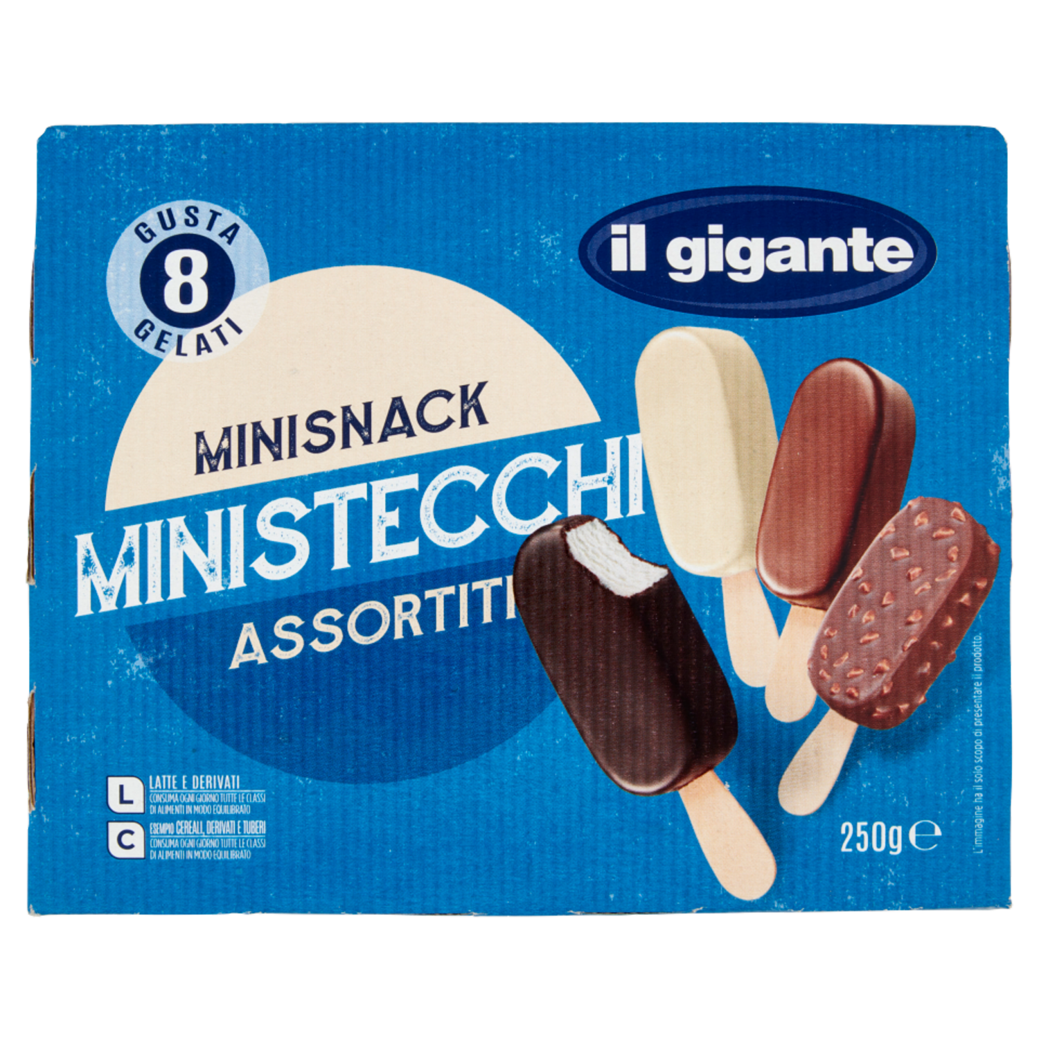 8 Ministecchi al gusto vaniglia: 2 con copertura con cioccolato al latte, 2 con copertura con cioccolato fondente, 2 con copertura con cioccolato al latte e mandorle, 2 con copertura con cioccolato bianco