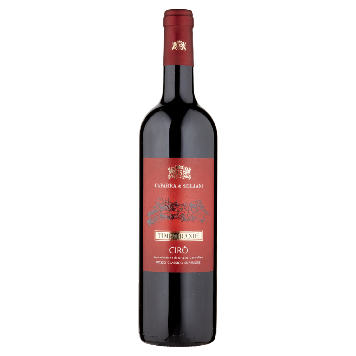 Timpagrande Cirò DOC Rosso Classico Superiore Riserva, vino rosso italiano. Vino rosso ottenuto dalla vinificazione di uve "Gaglioppo" in purezza, fermentate a contatto con le bucce e affinato in barriques di rovere francese per 24 mesi. Cirò Denominazione di Origine Controllata