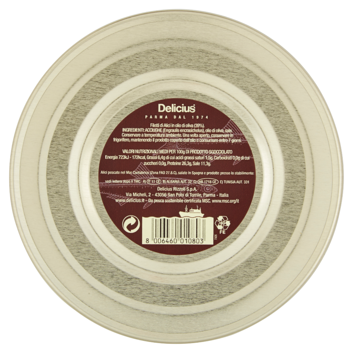 Alici pescate nel Mar Cantabrico (Zona FAO 27.8.C), salate in Spagna e prodotte presso lo stabilimento: vedi lettera dopo il TMC A) Bollo CE IT 11 CE B) Albania Aut. 32 C) Bollo CE HR 1718 CE E) Tunisia Aut. 331 Delicius Rizzoli S.p.A. Via Micheli, 2 43056 San Polo di Torrile, Parma Italia