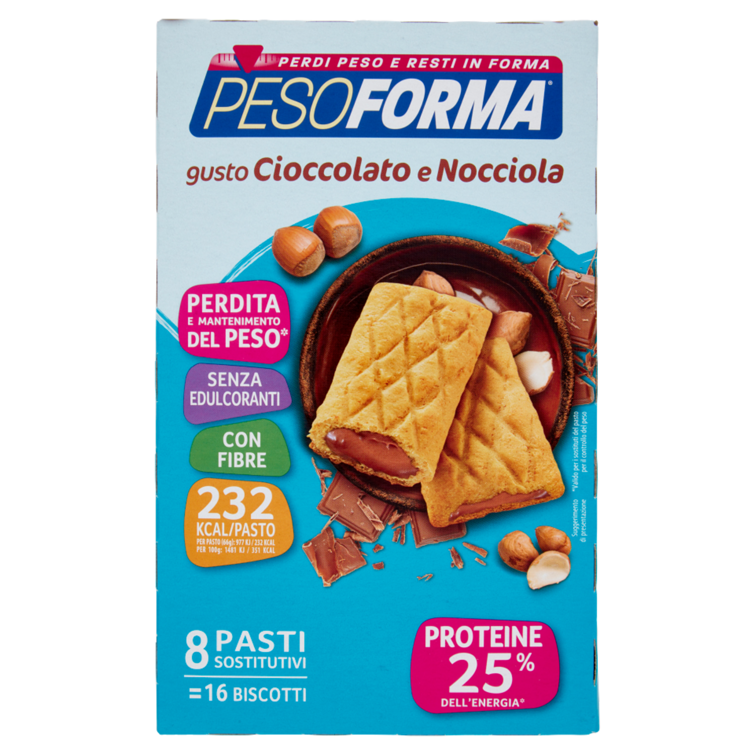 il Tuo Pesoforma sostituisci il pasto con 2 golosi biscotti** Pesoforma consiglia di consumare il pasto bevendo molta acqua. Attento al tuo benessere 13 vitamine* 11 minerali* Senza edulcoranti, coloranti e conservanti Pesoforma si impegna a migliorare costantemente le proprie ricette: con fibre e con meno zuccheri, per prodotti più sani. Scopri di più sul sito pesoforma.com Alleato della tua linea Ricco in proteine* 25% dell'energia Con fibre 232 kcal per pasto Perdita e mantenimento del peso* Fonte: EFSA (European Food Safety Authority) **Scegli uno stile di vita sano: mangia in modo vario ed equilibrato, bevi almeno due litri di acqua al giorno e pratica regolarmente attività fisica, ti sentirai più in forma. Per perdere peso, sostituisci due pasti principali al giorno con Pesoforma; per mantenere il peso sostituisci un pasto al giorno, nell'ambito di una dieta ipocalorica che comprenda anche altri alimenti. Ti consigliamo di chiedere un parere medico se desideri consumare il prodotto per più di tre settimane consecutive. *Valido per i sostituti del pasto per il controllo del peso