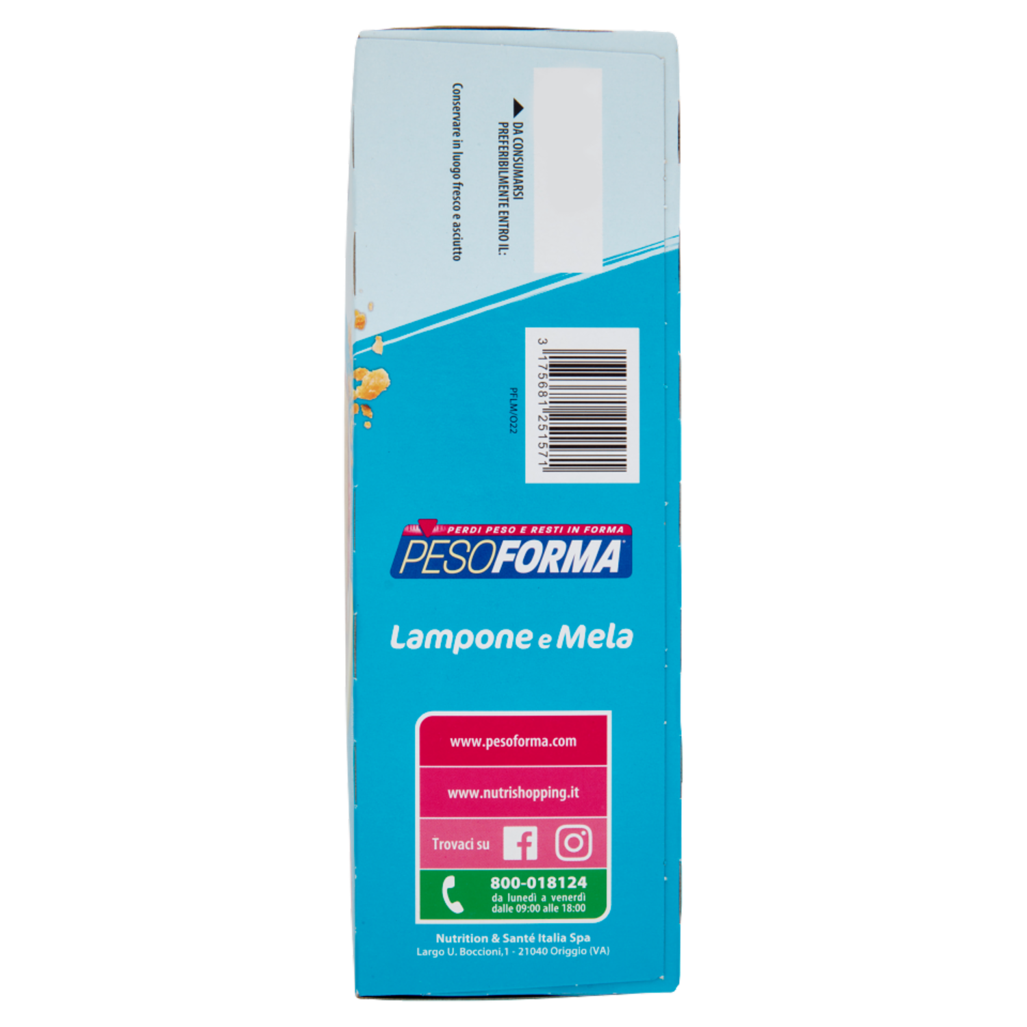 il Tuo Pesoforma sostituisci il pasto con 2 golosi biscotti** Pesoforma consiglia di consumare il pasto bevendo molta acqua. Attento al tuo benessere 13 vitamine* 11 minerali* Senza edulcoranti, coloranti e conservanti Pesoforma si impegna a migliorare costantemente le proprie ricette: con fibre e con meno zuccheri, per prodotti più sani. Scopri di più sul sito pesoforma.com Alleato della tua linea Ricco in proteine* 28% dell'energia Ricco in fibre 219 kcal per pasto Perdita e mantenimento del peso* Fonte: EFSA (European Food Safety Authority) **Scegli uno stile di vita sano: mangia in modo vario ed equilibrato, bevi almeno due litri di acqua al giorno e pratica regolarmente attività fisica, ti sentirai più in forma. Per perdere peso, sostituisci due pasti principali al giorno con Pesoforma; per mantenere il peso sostituisci un pasto al giorno, nell'ambito di una dieta ipocalorica che comprenda anche altri alimenti. Ti consigliamo di chiedere un parere medico se desideri consumare il prodotto per più di tre settimane consecutive. *Valido per i sostituti del pasto per il controllo del peso