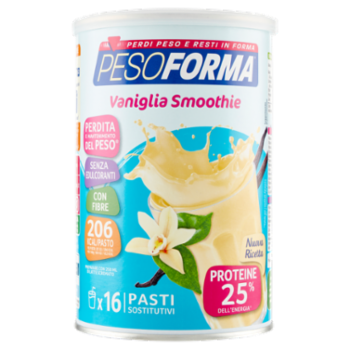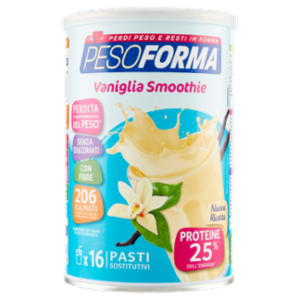 il Tuo Pesoforma sostituisci il pasto con un goloso Smoothie** Pesoforma consiglia di bere almeno 2 litri di acqua durante la giornata. Alleato della tua linea Ricco in proteine* 25% dell'energia Con fibre 206 kcal per pasto Attento al tuo benessere 13 vitamine* 11 minerali* Senza edulcoranti e conservanti Pesoforma si impegna a migliorare costantemente le proprie ricette: con fibre e con meno zuccheri, per prodotti più sani. Scopri di più sul sito pesoforma.com Perdita e mantenimento del peso* Fonte: EFSA (European Food Safety Authority) **Scegli uno stile di vita sano: mangia in modo vario ed equilibrato, bevi almeno due litri di acqua al giorno e pratica regolarmente attività fisica, ti sentirai più in forma. Per perdere peso, sostituisci due pasti principali al giorno con Pesoforma; per mantenere il peso sostituisci un pasto al giorno, nell'ambito di una dieta ipocalorica che comprenda anche altri alimenti. Ti consigliamo di chiedere un parere medico se desideri consumare il prodotto per più di tre settimane consecutive. *Valido per i sostituti del pasto per il controllo del peso