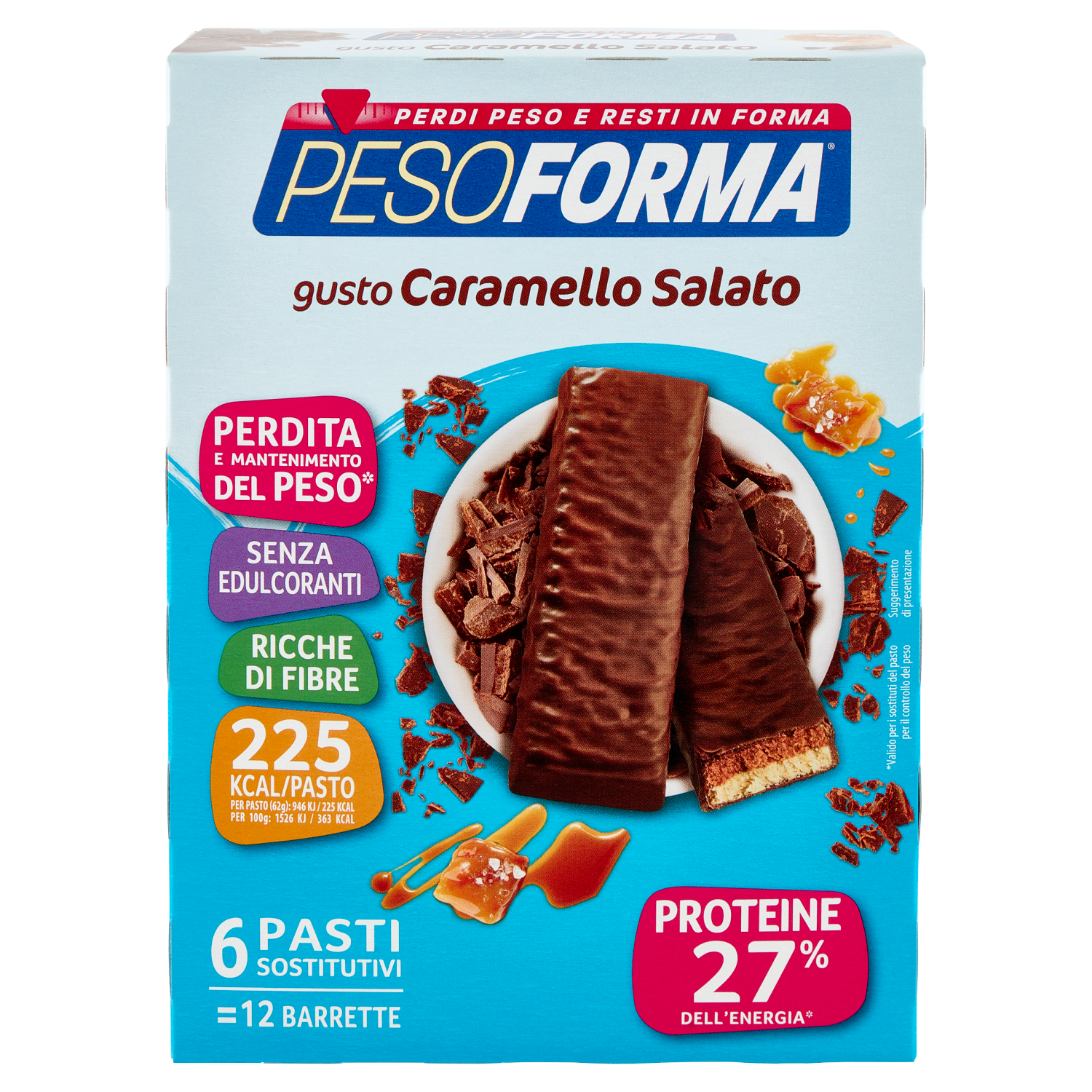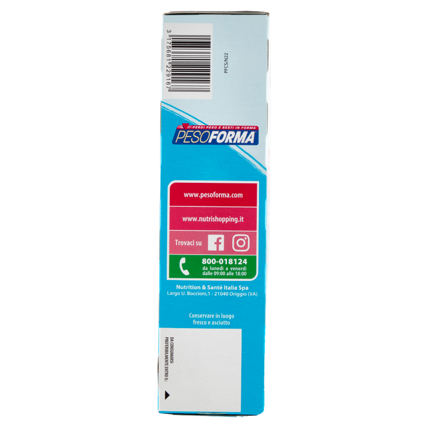 il Tuo Pesoforma sostituisci il pasto con 2 golose barrette** Pesoforma consiglia di consumare il pasto bevendo molta acqua. Attento al tuo benessere 13 vitamine* 11 minerali* Senza edulcoranti, coloranti e conservanti Pesoforma si impegna a migliorare costantemente le proprie ricette: con fibre e con meno zuccheri, per prodotti più sani. Scopri di più sul sito pesoforma.com Alleato della tua linea Ricco di proteine* 27% dell'energia Ricco di fibre 225 kcal per pasto Perdita e mantenimento del peso* Fonte: EFSA (European Food Safety Authority) **Scegli uno stile di vita sano: mangia in modo vario ed equilibrato, bevi almeno due litri di acqua al giorno e pratica regolarmente attività fisica, ti sentirai più in forma. Per perdere peso, sostituisci due pasti principali al giorno con Pesoforma; per mantenere il peso sostituisci un pasto al giorno, nell'ambito di una dieta ipocalorica che comprenda anche altri alimenti. Ti consigliamo di chiedere un parere medico se desideri consumare il prodotto per più di tre settimane consecutive. *Valido per i sostituti del pasto per il controllo del peso