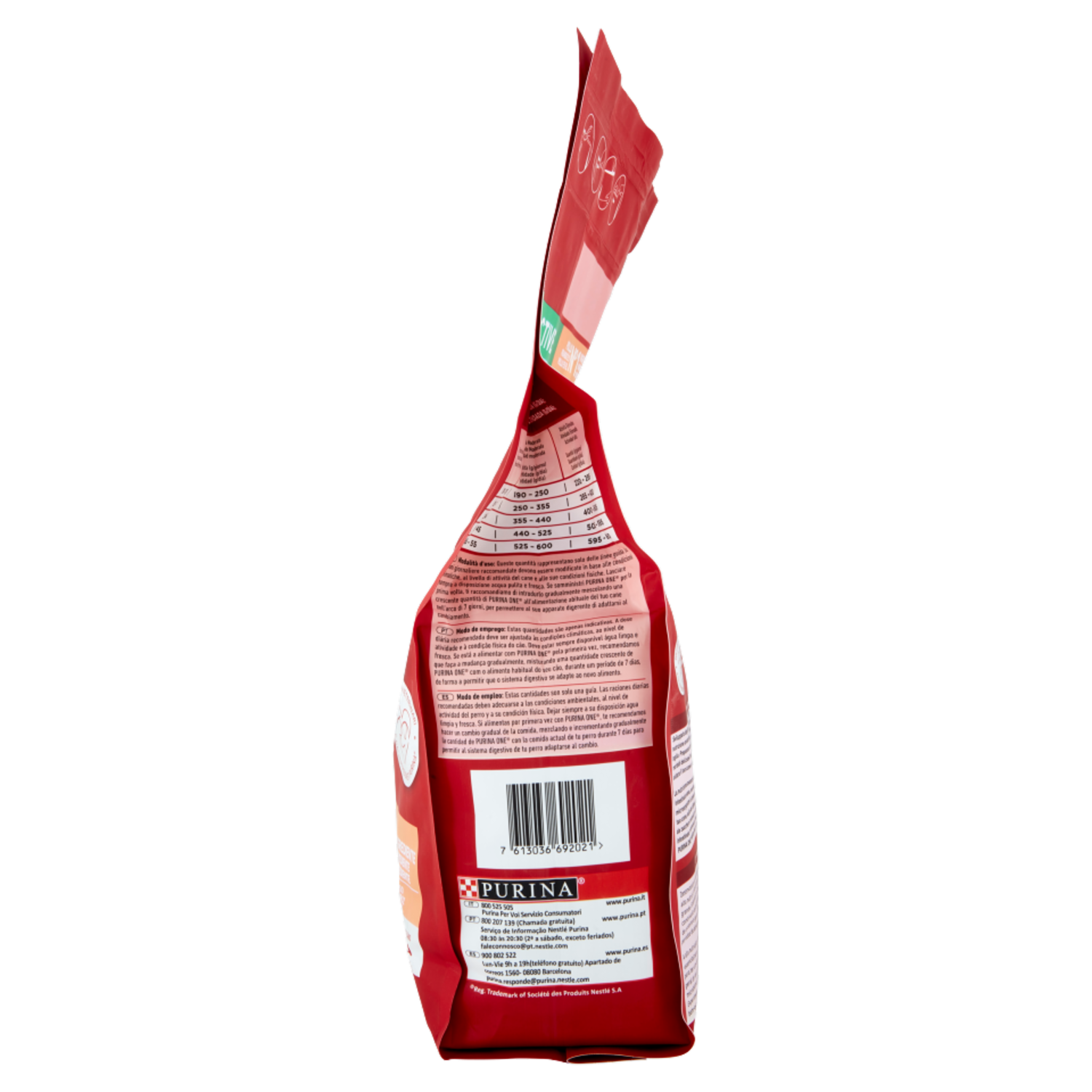 Razione giornaliera raccomandata (g/giorno): Peso del cane (kg): 10 - 15 | Attività Moderata: Quantità (g/giorno): 190 - 250 | Attività Elevata: Quantità (g/giorno): 220 - 285 Peso del cane (kg): 15 - 25 | Attività Moderata: Quantità (g/giorno): 250 - 355 | Attività Elevata: Quantità (g/giorno): 285 - 400 Peso del cane (kg): 25 - 35 | Attività Moderata: Quantità (g/giorno): 355 - 440 | Attività Elevata: Quantità (g/giorno): 400 - 505 Peso del cane (kg): 35 - 45 | Attività Moderata: Quantità (g/giorno): 440 - 525 | Attività Elevata: Quantità (g/giorno): 505 - 595 Peso del cane (kg): 45 - 55 | Attività Moderata: Quantità (g/giorno): 525 - 600 | Attività Elevata: Quantità (g/giorno): 595 - 680 Modalità d'uso: Queste quantità rappresentano solo delle linee guida. Le razioni giornaliere raccomandate devono essere modificate in base alle condizioni climatiche, al livello di attività del cane e alle sue condizioni fisiche. Lasciare sempre a disposizione acqua pulita e fresca. Se somministri PURINA ONE per la prima volta, ti raccomandiamo di introdurlo gradualmente mescolando una crescente quantità di PURINA ONE all'alimentazione abituale del tuo cane nell'arco di 7 giorni, per permettere al suo apparato digerente di adattarsi al cambiamento.