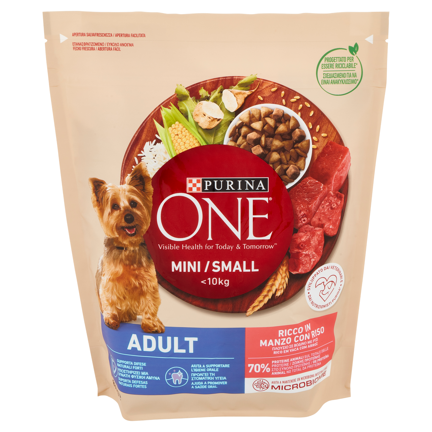Per cani di piccola taglia a partire da 1 anno di età La polpa di barbabietola da zucchero aiuta a mantenere un microbioma intestinale sano, essenziale per la buona salute del tuo cane Senza coloranti, aromi artificiali e conservanti artificiali aggiunti Supporta difese naturali forti Igiene orale per denti e gengive grazie a nutrienti essenziali e crocchette fragranti Mantiene pelle sana e pelo splendido grazie a specifici livelli di nutrienti chiave Aiuta a supportare il metabolismo più veloce dei cani di piccola taglia con specifici livelli elevati di proteine e grassi Sviluppato dai veterinari e dai nutrizionisti PURINA Piccole crocchette fragranti e deliziose e bocconi più morbidi° PURINA ONE ⁽ ⁾Salute visibile oggi e domani PURINA ONE Mini/Small <10kg Adult è una ricetta nutriente per cani a partire da 1 anno di età. È ricca in Manzo con un elevato livello di antiossidanti per supportare le difese naturali e con nutrienti essenziali per aiutare a supportare una buona igiene orale. Il tuo cane di piccola taglia ha esigenze nutrizionali specifiche. I nostri esperti Purina hanno sviluppato una nutrizione avanzata e specifica che aiuta a mantenere sano il micorbioma intestinale. Un pasto delizioso grazie a piccole fragranti crocchette e a bocconi più morbidi°. Progettato per essere riciclabile* *Questa confezione è progettata per essere riciclabile. Le modalità di raccolta e riciclo di questa confezione possono variare in ogni paese. Verifica sul sito www.purina.eu/packaging °morbidezza variabile nel tempo - Apertura salvafreschezza / Apertura facilitata - Progettato per essere riciclabile* - <10kg - Sviluppato dai veterinari e dai nutrizionisti PURINA - Supporta difese naturali forti - Aiuta a supportare l'igiene orale - 70% Proteine animali sul totale delle proteine - Aiuta a mantenere un microbioma intestinale sano - *Questa confezione è progettata per essere riciclabile. Le modalità di raccolta e riciclo di questa confezione possono variare in ogni paese. Verifica sul sito www.purina.eu/packaging.